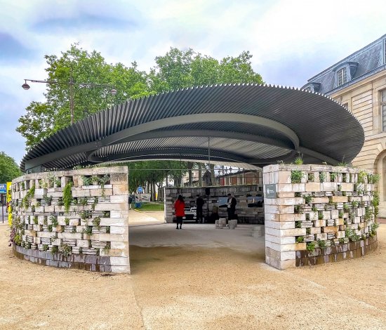 Two openings facing the Château de Versailles offer a series of perspectives. As if in levitation, a curved roof covers the dry stone structure. This pavilion is also a demonstrator of the city's hidden resources: it exposes the potential of the material deposits, the challenges linked to their reuse and encourages reflection on the restoration of ecological environments in urban areas.