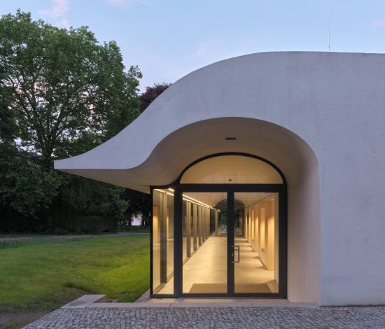 Our team was responsible for the structural engineering and building physics. The key design element of the lightweight concrete building is the curved roof of the foyer. The realisation of the simple form proved to be a challenge in terms of concrete technology and building physics. As a result, the clear structure blends seamlessly into the historical site and creates a balance between contemporary architecture and the profound and sensitive history of the location.
