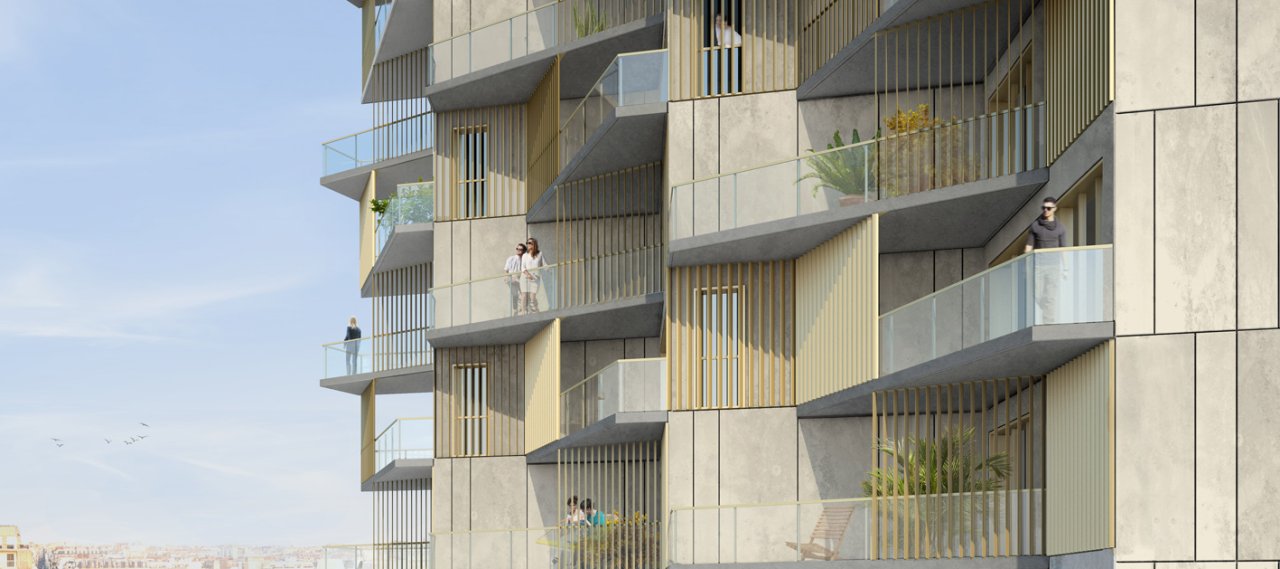 Our intervention was within the domain of facades which consists of a multitude of triangular balconies offset between levels on one face while the other two faces are drawn on the basis of a pierced surface.
