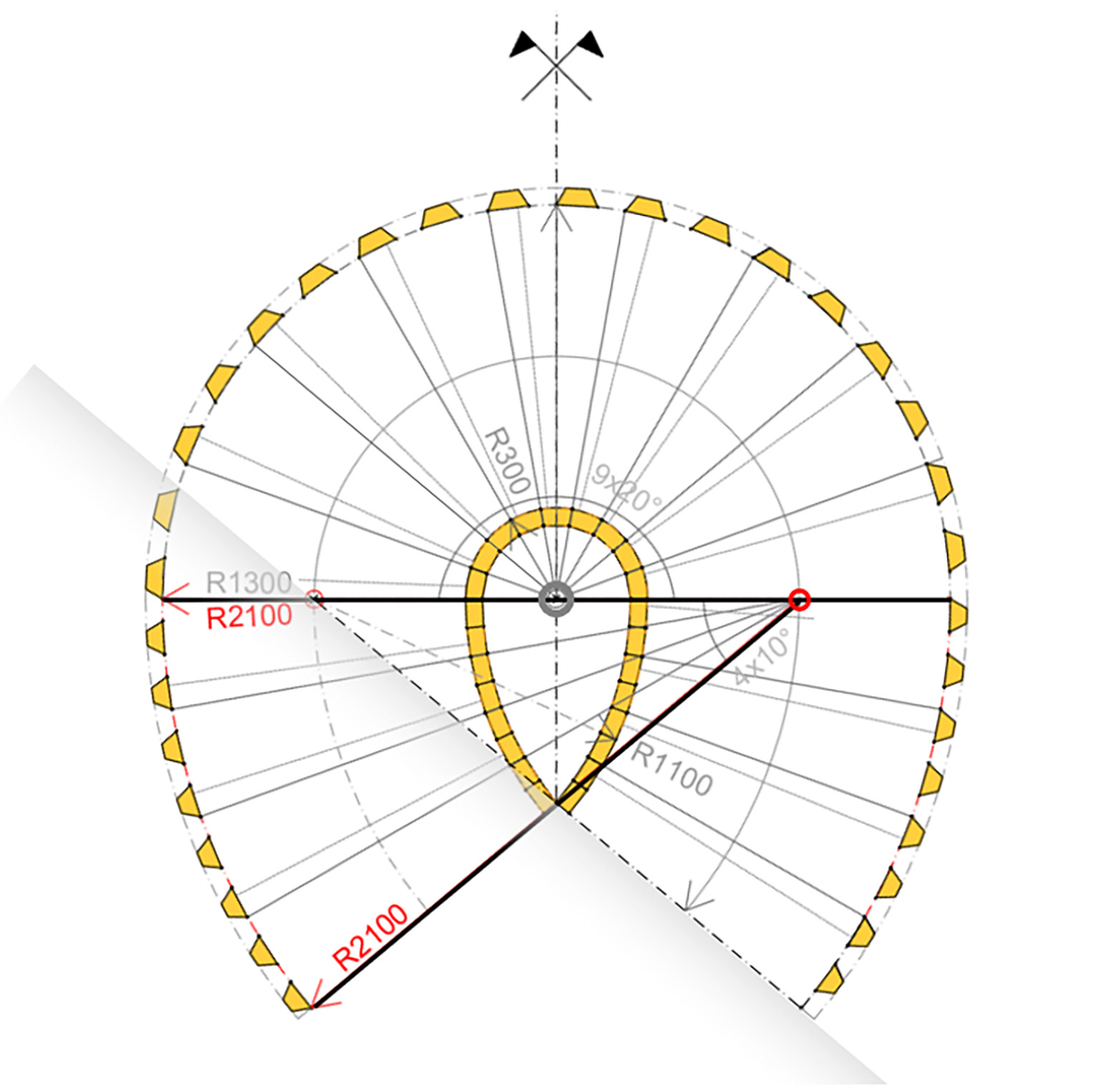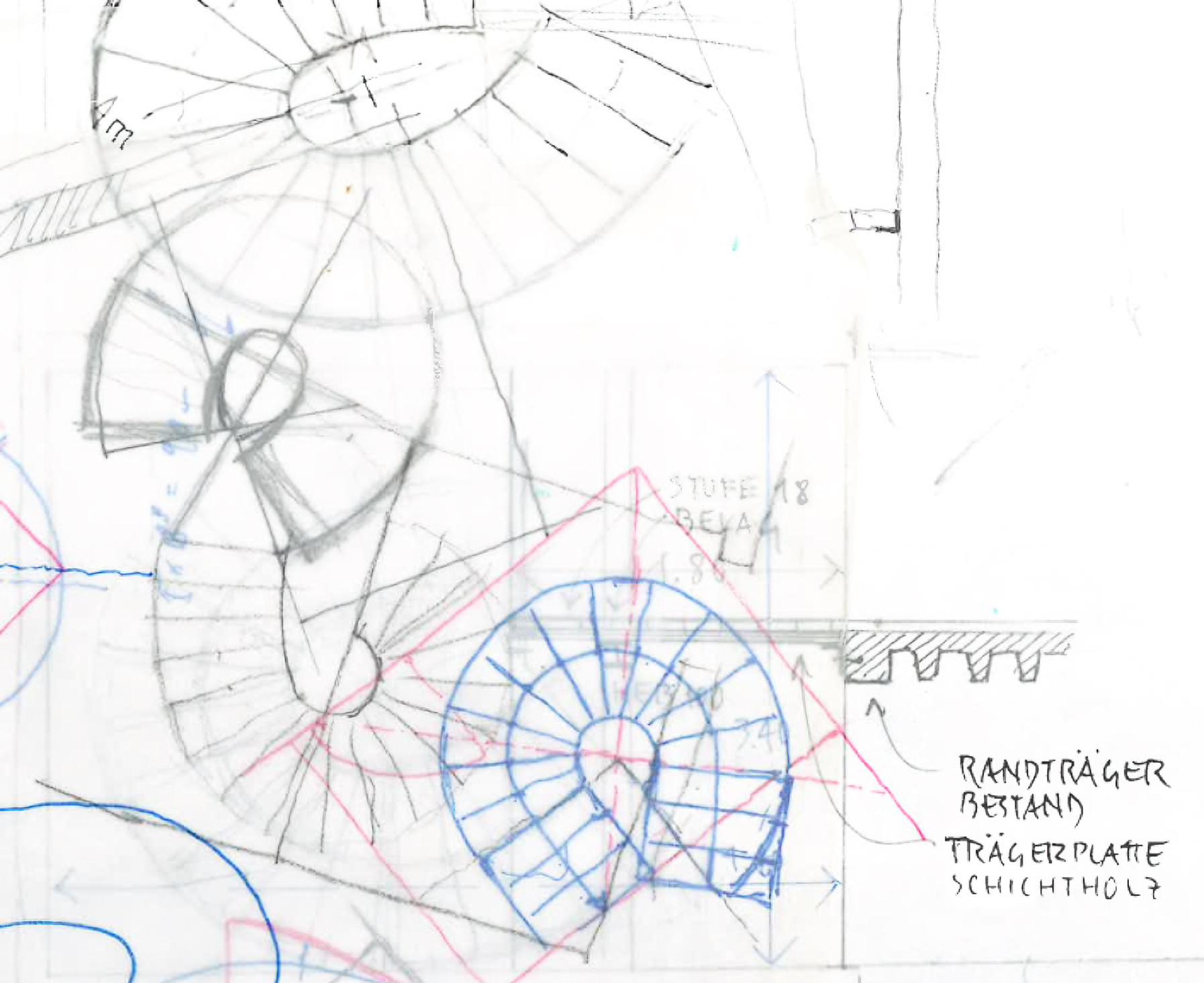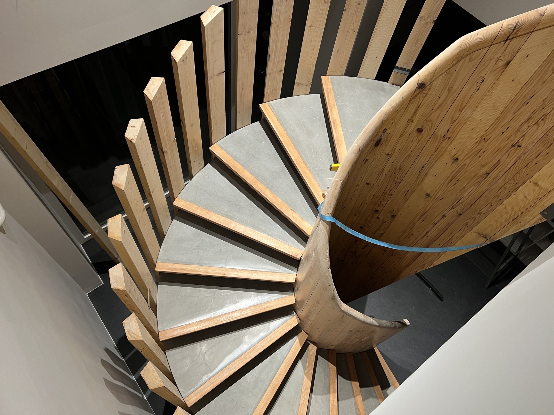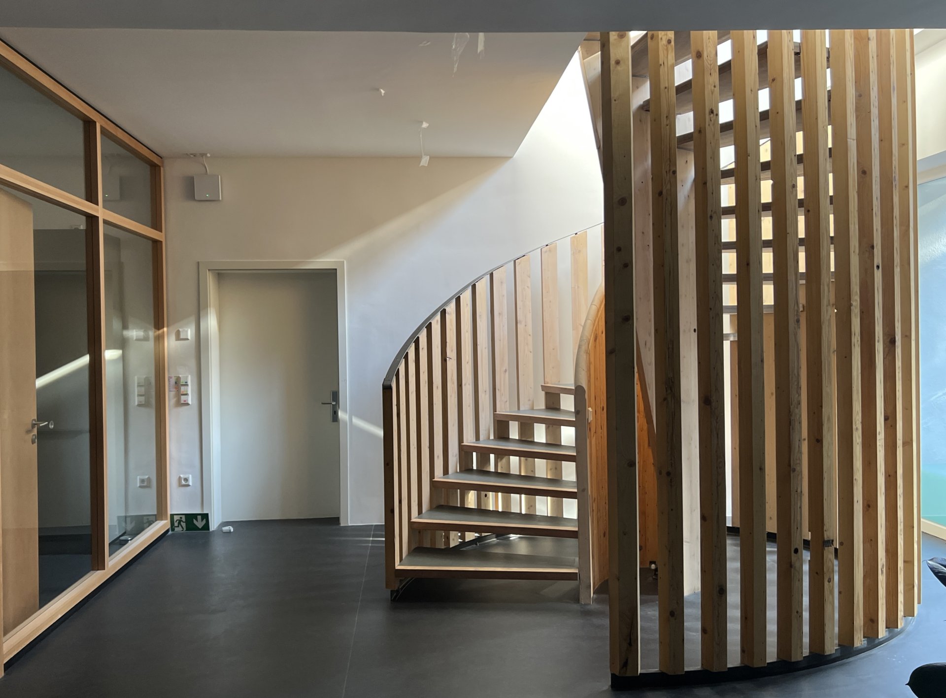The staircase's structural design is based on the load-bearing capacity of the steps, which rest directly on the floor slab. To bridge the 3.23-metre floor-to-floor height, a staircase comprising 18 steps was designed. Given the open spatial structure, the optimal solution was a spiral staircase shaped like approximately three-quarters of a circle with varying radii and a slightly widened centre, as this keeps pathways clear and makes efficient use of the space. Clear radii and angles were used to define the geometry and ensure simple, straightforward construction.