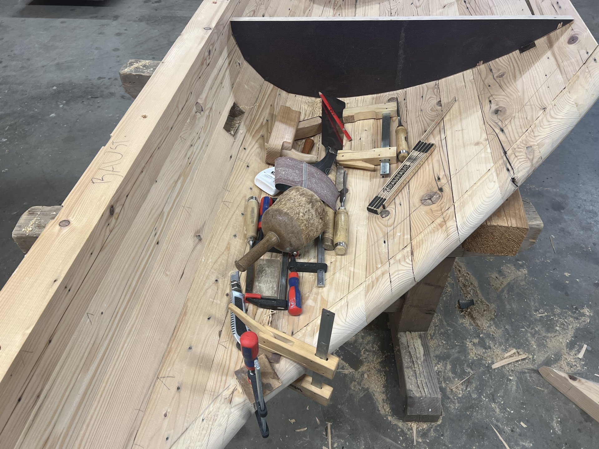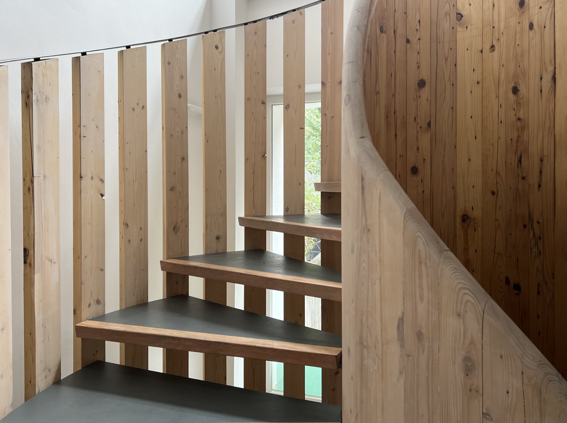 The load-bearing stringers were designed as continuous curved surfaces that also serve as handrails. The timber structure was constructed from reused demolition beams. Preparing them placed high demands on workmanship and logistics, whilst also highlighting the challenges of circular construction processes.