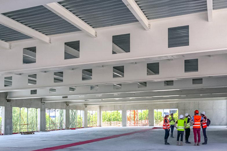 De dakconstructie van de grote hal bestaat uit tot 80 m lange Warren-spanten met een hoogte van 5,15 m, terwijl voor de twee gymzalen is gekozen voor een combinatie van massieve en houten bouwelementen. De plint bestaat uit een stalen vakwerkgevel en geventileerde houten bekleding op metselwerk op de ondoorzichtige delen van de gevel. Het terras wordt omringd door een band met geventileerde bekleding op een betonnen borstwering. In het bovenste gedeelte is de gevel ontworpen als geventileerde composiet gevelbekleding bevestigd aan een aluminium frame.