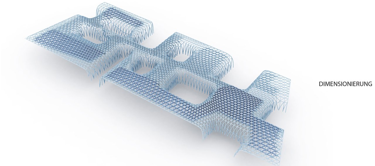 The design proposal is characterized by its close interaction between architecture and supporting structure. The key element is the roof structure, which starts from a flat roof and is deformed generatively. This process creates a seamless transition from the roof to the facade of each individual utilization unit.