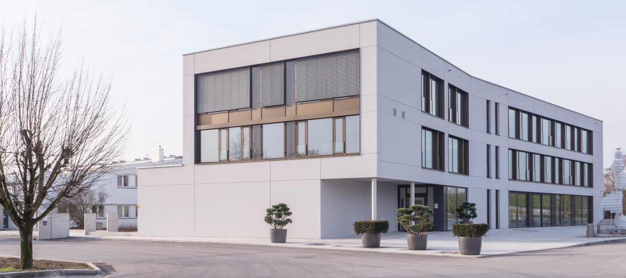 The business expansion of the company Max Frank GmbH & Co. KG includes the dismantling of the existing container complex as well as the construction of an administrative building on the same site with generous open spaces and a new parking area. The new complex is connected to the existing building by a connecting bridge on the first floor.