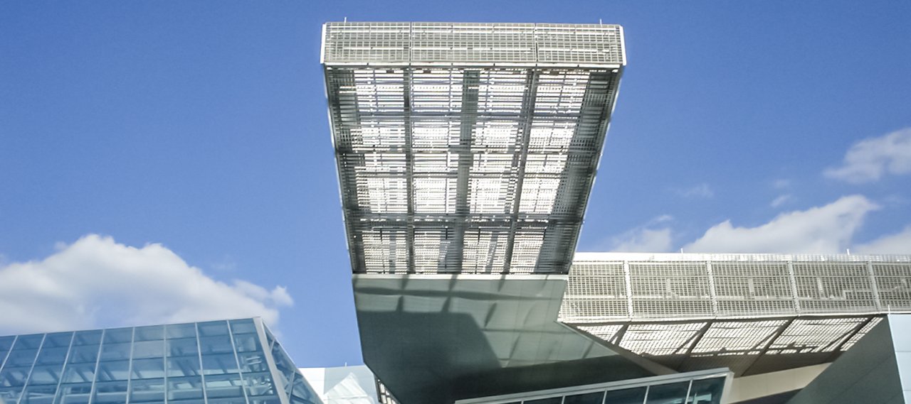 The design is concentrated on the superimposed roof and the glazed foyer with all public functions, such as lecture hall, library and cafeteria. From various angles of the city and along the two adjacent main streets, the roof stands out recognizably past the old building. It rests mainly on one central support, which accommodates the only closed room in the foyer and merges it with the underside warped, projecting wings. The wings with the projection of just under 40 m were constructed from welded box girder profiles, ending in a permeable grid-construction.