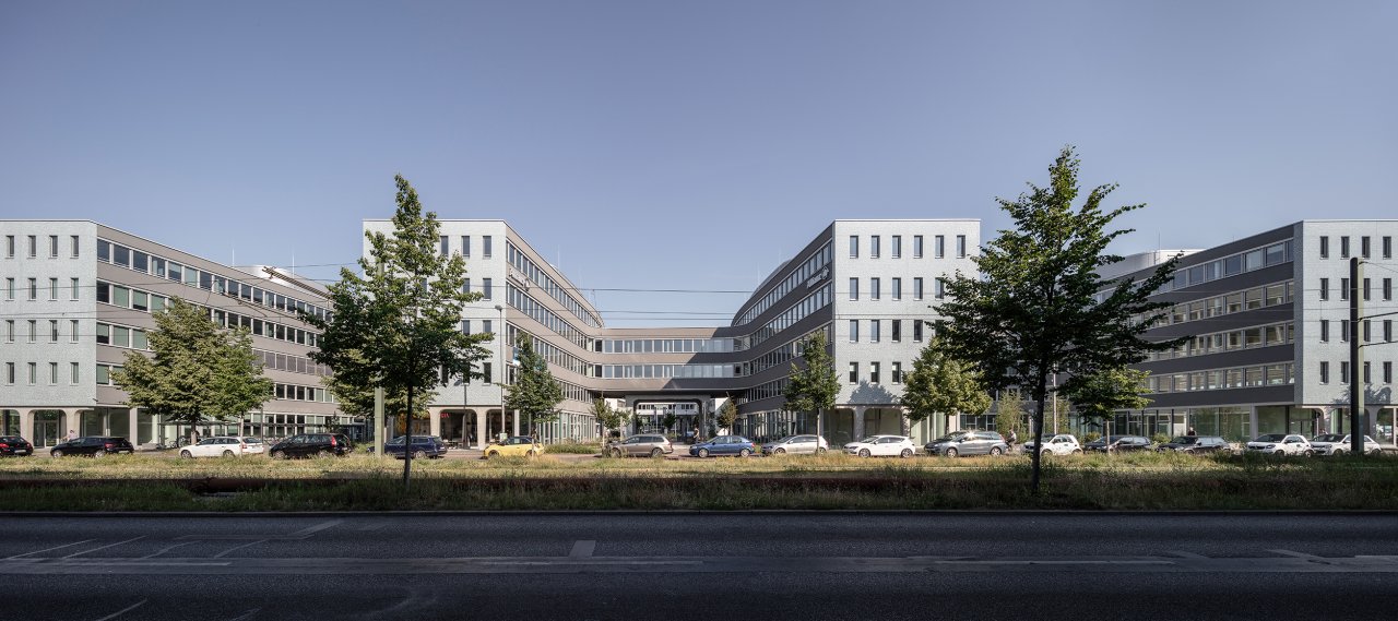 The new building of the Berlin headquarters of Allianz Germany is located on the former barracks site on Rudower Chaussee. The office complex with a total of 60,000 m² of rental space consists of three building parts, each with five storeys. Two connecting bridges between the buildings were also built.