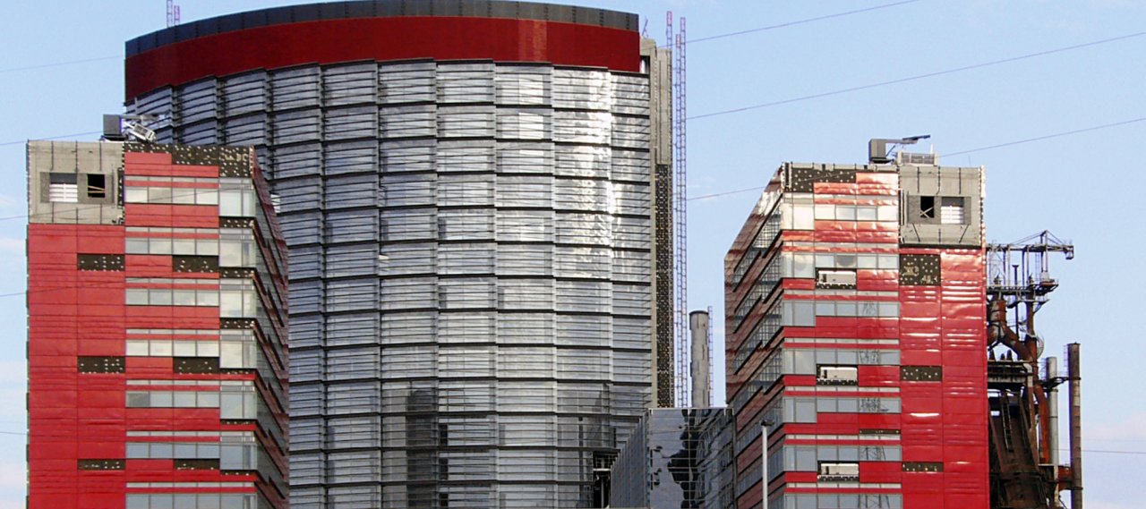 The first completed building complex consists of a 75 m high, curved tower in the shape of a wavy disk with two additional smaller towers. The atrium with a fully glazed roof serves as the centre of the complex. The roof structure of the tower was carried out as a composite slab with exposed steel beams and the concrete ceiling slab. A fire assessment was carried out, which allowed them that the steel-structure could be built without fire protection and still provides the required fire resistance. The roof structure of the atrium was developed as a three-dimensional framework. The design concept of the free geometrical configuration of V-shaped trusses and suspensions rods reminds of a grid dancing on paper clips.
