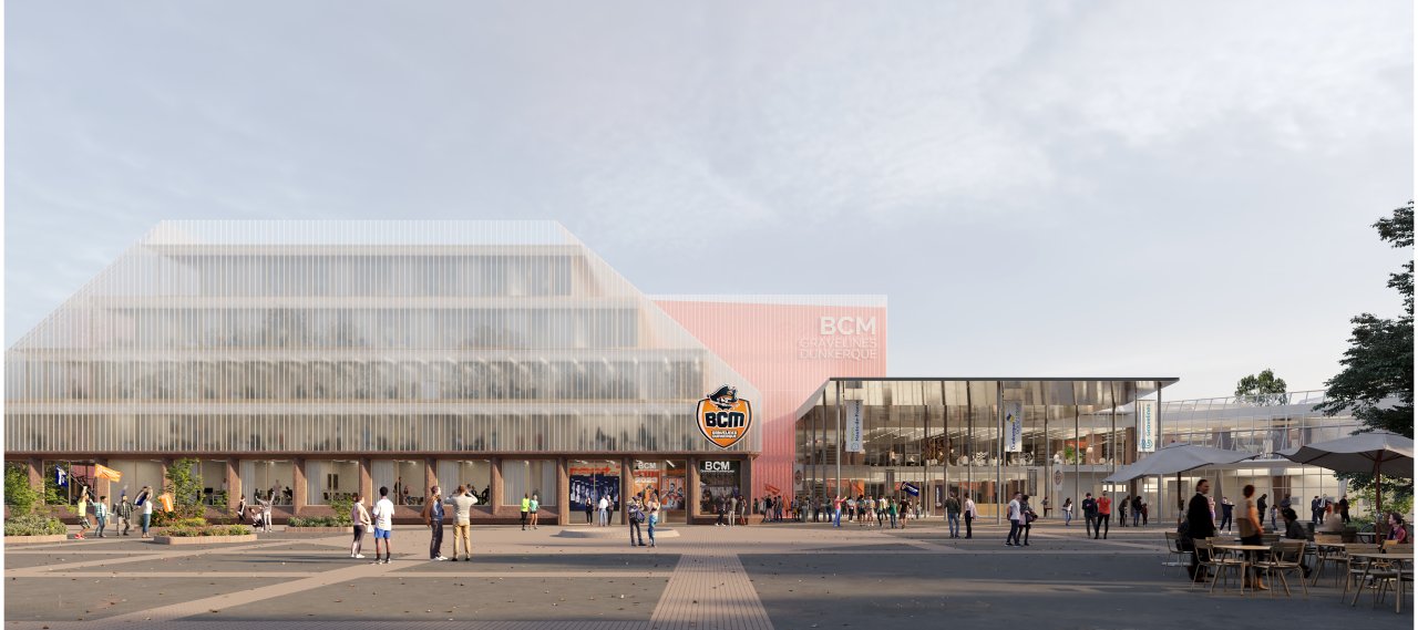 The initial project focused on refurbishing and extending the Sportica basketball arena in Gravelines. The design featured a 60-meter hybrid timber-steel frame supporting reinforced concrete bleachers. The beam's curved shape allowed it to align with the existing column grid while widening to accommodate the iconic central cube.