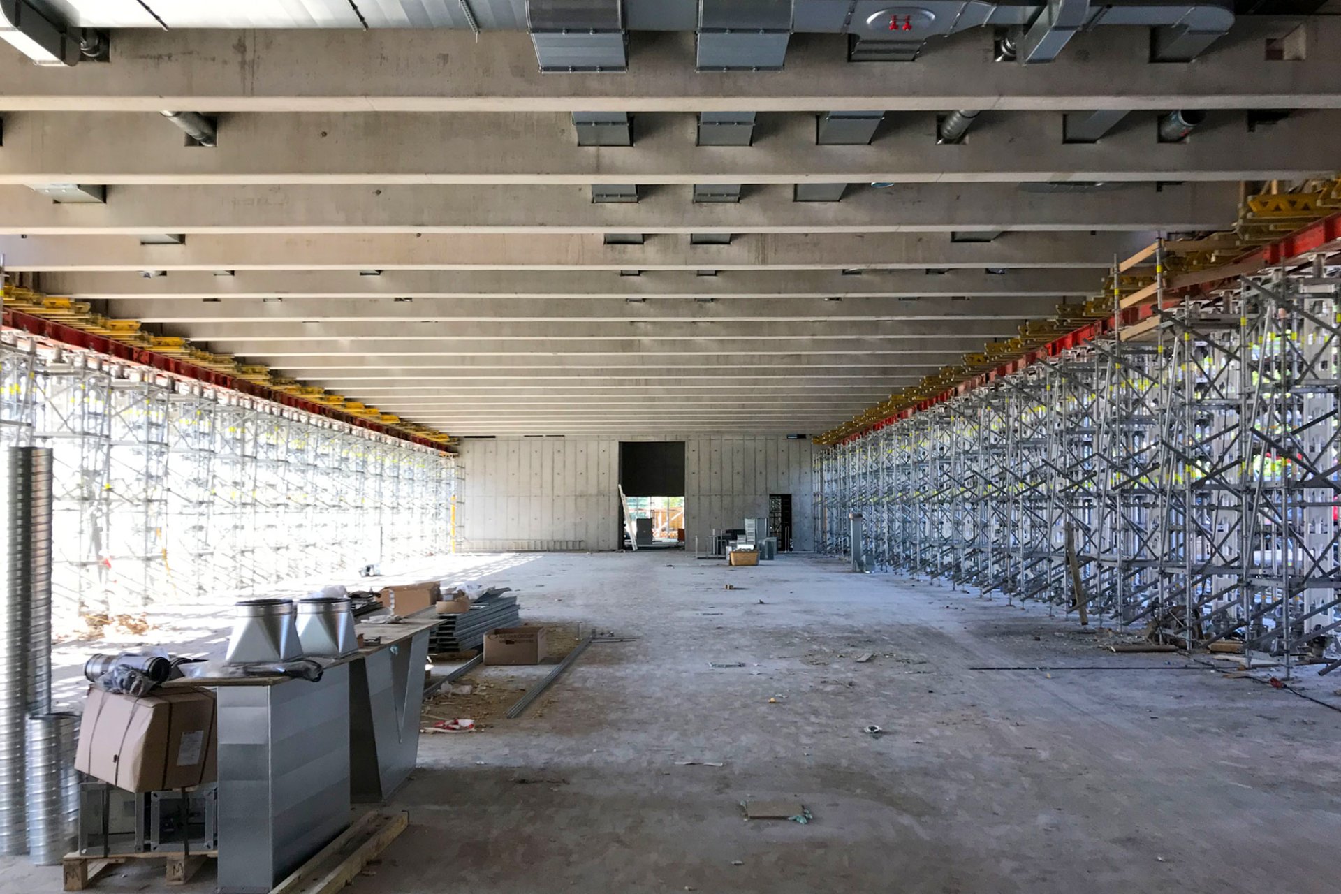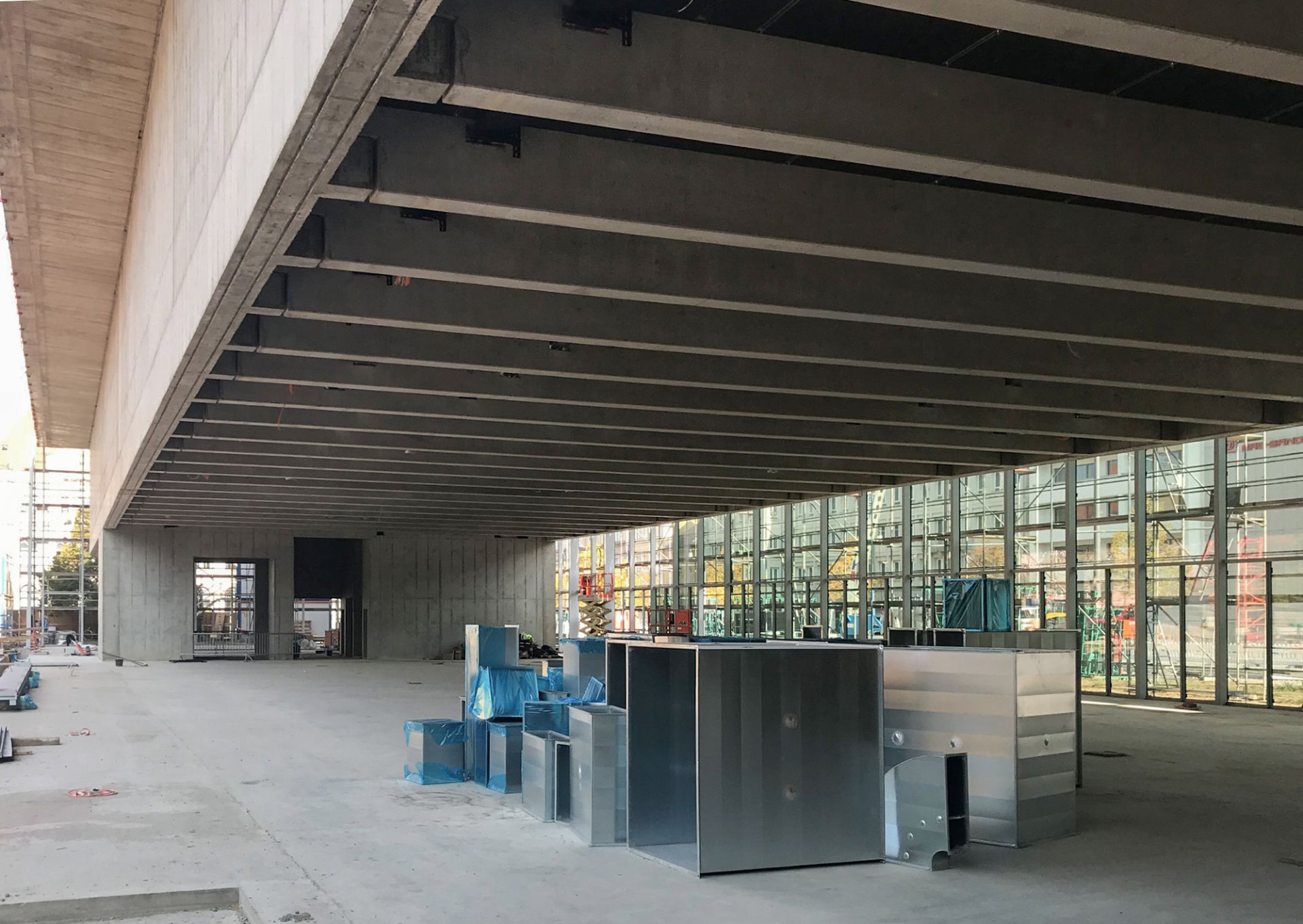 The construction of the black box can be compared to a bridge construction. The two longitudinal walls of the black box form the load-bearing system and span 50 m from the core to the core or 18 m over their support. The bearings are formed by the cores, which connect the floors with each other.
