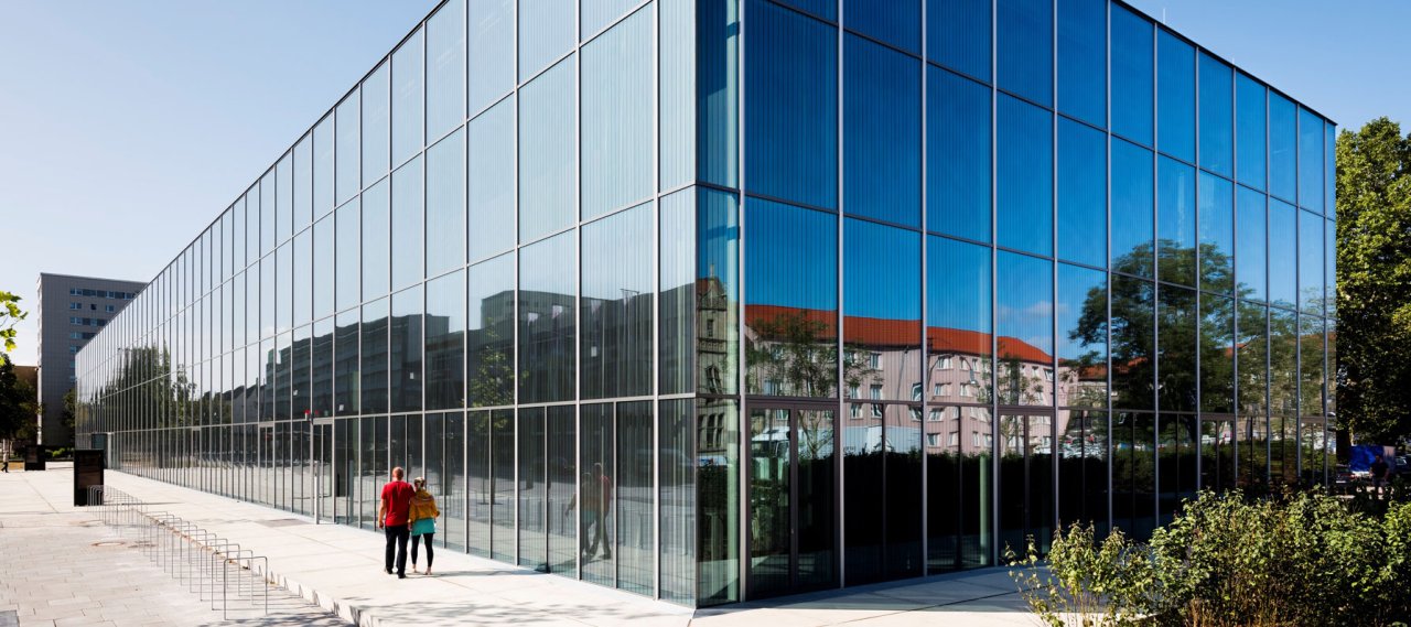 The two-storey museum with partial basement houses the exhibition area on the 1st floor consisting of a closed, approx. 99 m long room, the so-called black box, which is based exclusively on the staircase cores. The ground floor offers an open stage for events, further areas accommodate administration and logistics. The glass façade is set back by approx. 3.3 m to the outside in front of the black box.