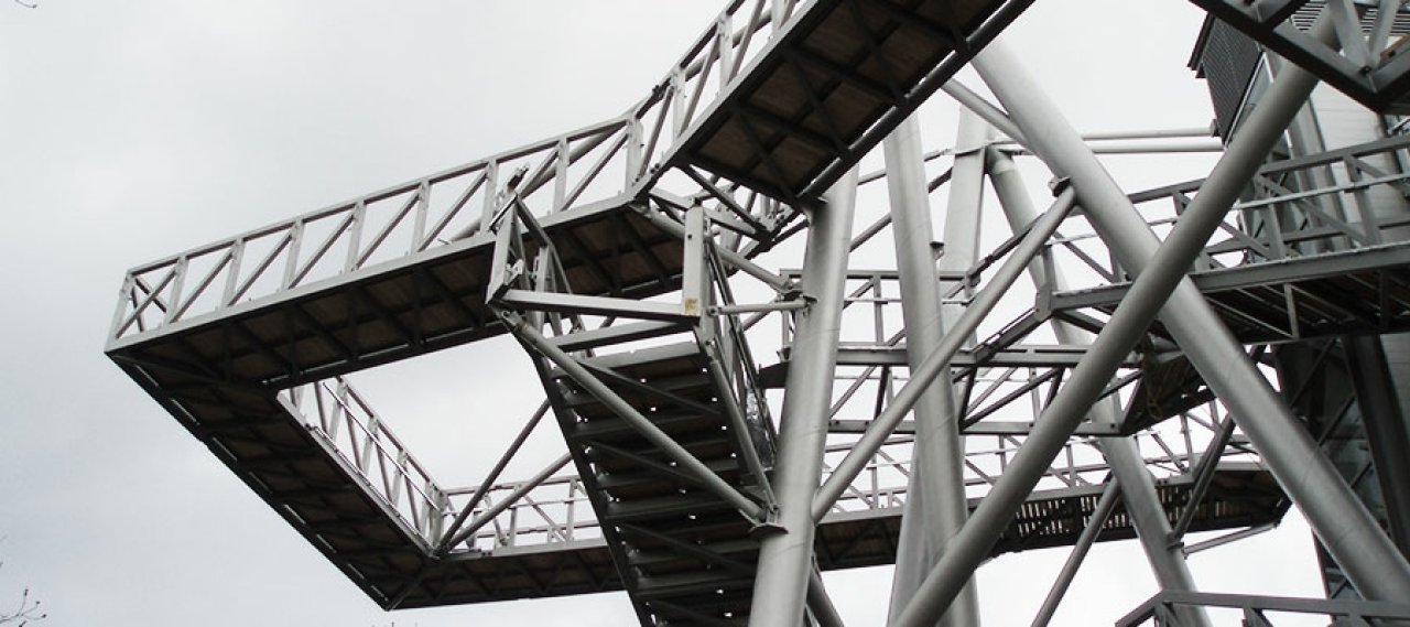 The "treetop walk" is a steel structure composed of steps and platforms. These are connected to the primary and secondary structure with various struts and connections. The balustrade consists of a glazed truss frame. The loading platforms consist of steel grating supported on the beams. Steel gratings form the treads of the stair which are screwed to the sub-girders of the trusses. A glazed steel frame for the lift core is integrated into the structure. The foundation consists of piles, which are partially connected through foundation beams and the lift pit construction. The steel struts are rigidly connected to the foundation beams via shaggered mounting parts encased in the concrete and with welded-on screw bases.