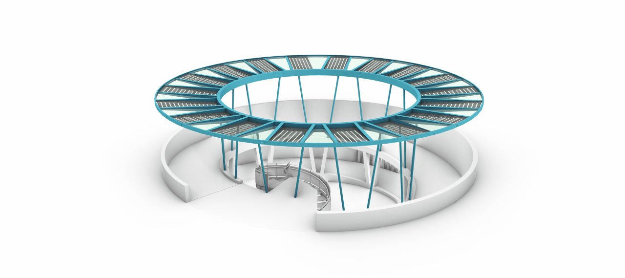 Die Überdachung wurde in Form eines Kreisrings mit einem äußeren Durchmesser von ca. 21 m geplant. Sie liegt auf beidseitig gelenkigen Pendelstützen, die über ihre Schrägstellung für die Aussteifung sorgen. Die Pendelstützen stehen auf einer Stahlbetonrampe und darunter liegenden Stahlbetonstützen, deren Fußpunkte der Rampengeometrie folgen. Das Besondere der Dachstützen ist, dass sie sehr schlank ausgebildet werden können und inwendig die Regenentwässerung nach unten leiten.