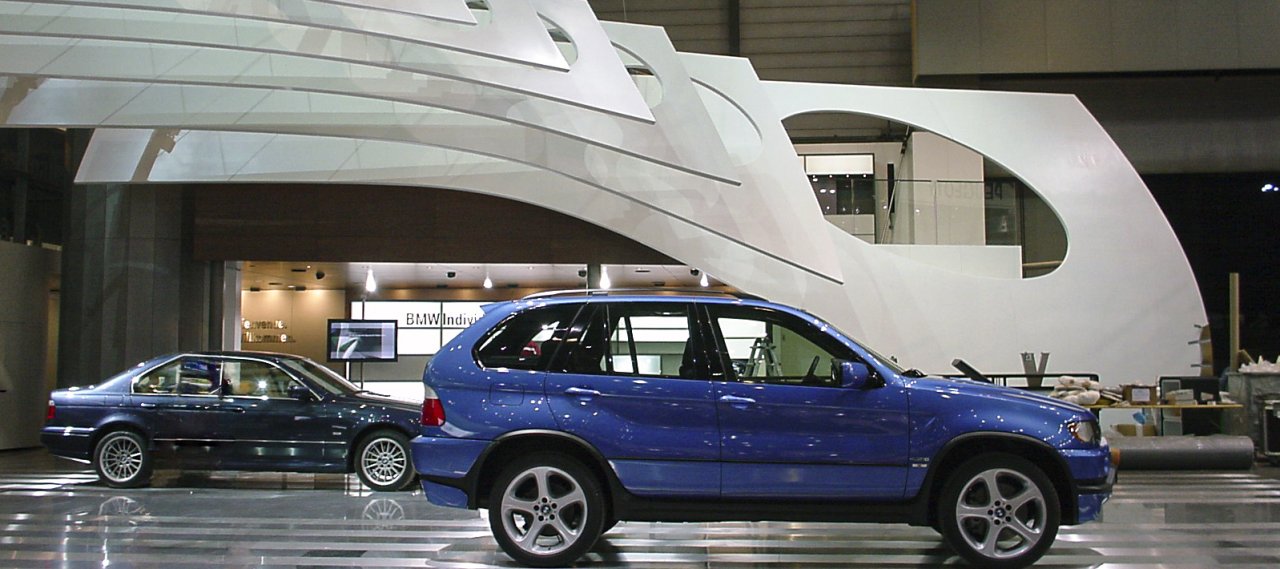 The BMW group presented the brands BMW and MINI together at an exhibition stand with a total floor area of 1,200 m² on two floors. The leading subject"efficiency meets dynamics" was supposed to be expressed in the architecture as well. A free-suspended structure above the stand, the so-called "lightarc" was planned. The abstract form of the fins was designed to create a super-sign visible from the distance for the visitors of the exhibition hall.