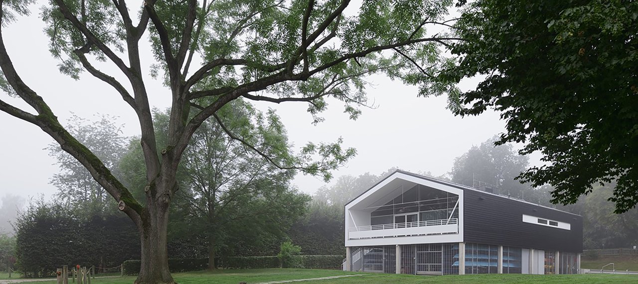 The building is mainly a timber construction and consists of a ground floor (storage of the boats), an upper floor (seminar rooms) and the attic (only building services). The roof was designed as a purlin roof in the rear area and as a rafter roof at the front with a slight slope.