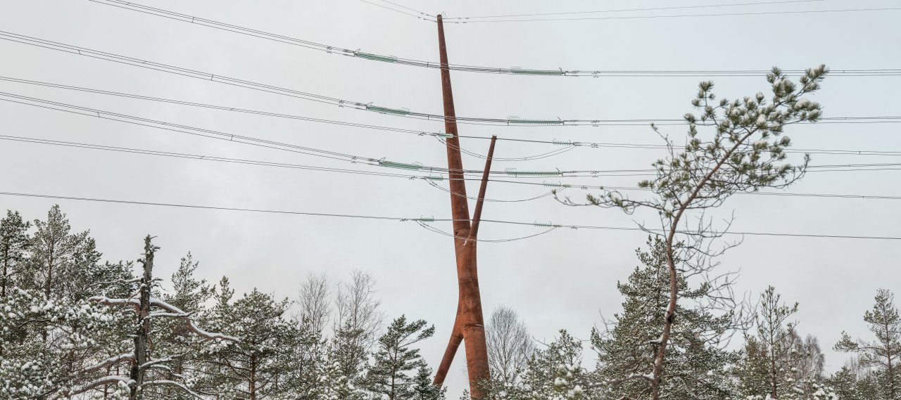 The focus during the development of the 45 m tall high voltage pylon was to use as little material as possible for the mounting process, resulting in a four-branch pylon resembling a squatting fox. As part of an international competition, PART Architects were selected to design and build this dominant deviation pylon, which sits on a prominent site adjacent to a nature reserve creating a towering new landmark in the region.