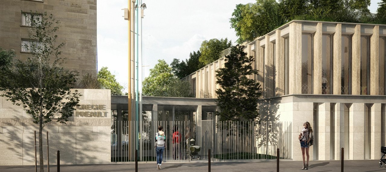 The project, located in the 19th arrondissement of Paris, involves the construction of a building comprising two simple volumes, one on the ground floor and the other on the first floor, connected by a central entrance hall and housing a 99-bed crèche, as well as two basement levels containing 50 parking spaces and technical premises.