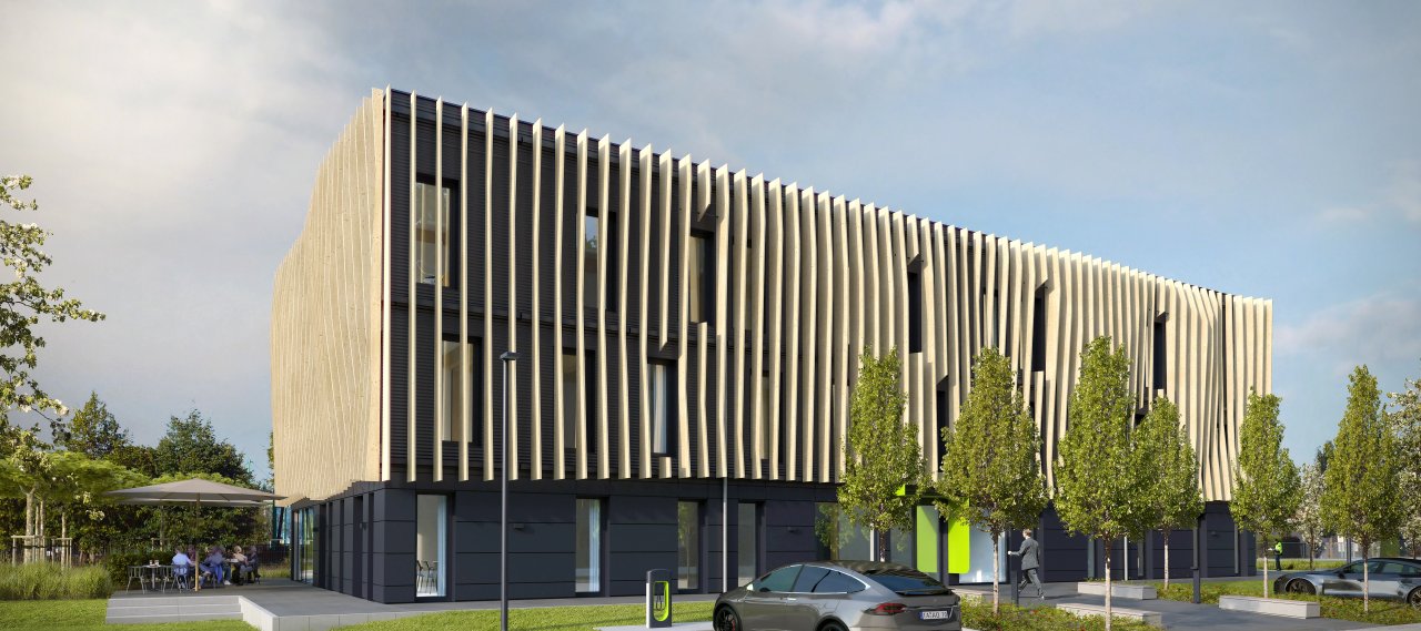 The new three-storey office building was built using a modular timber construction method. For this purpose, 69 room modules were prefabricated and assembled on site in a Tetris-like manner, which took only three weeks. The new building consists of two sections of space connected by a corridor in the centre of the building, parallel to the long side of the structure. The lift shaft inside the new building is also made of timber.