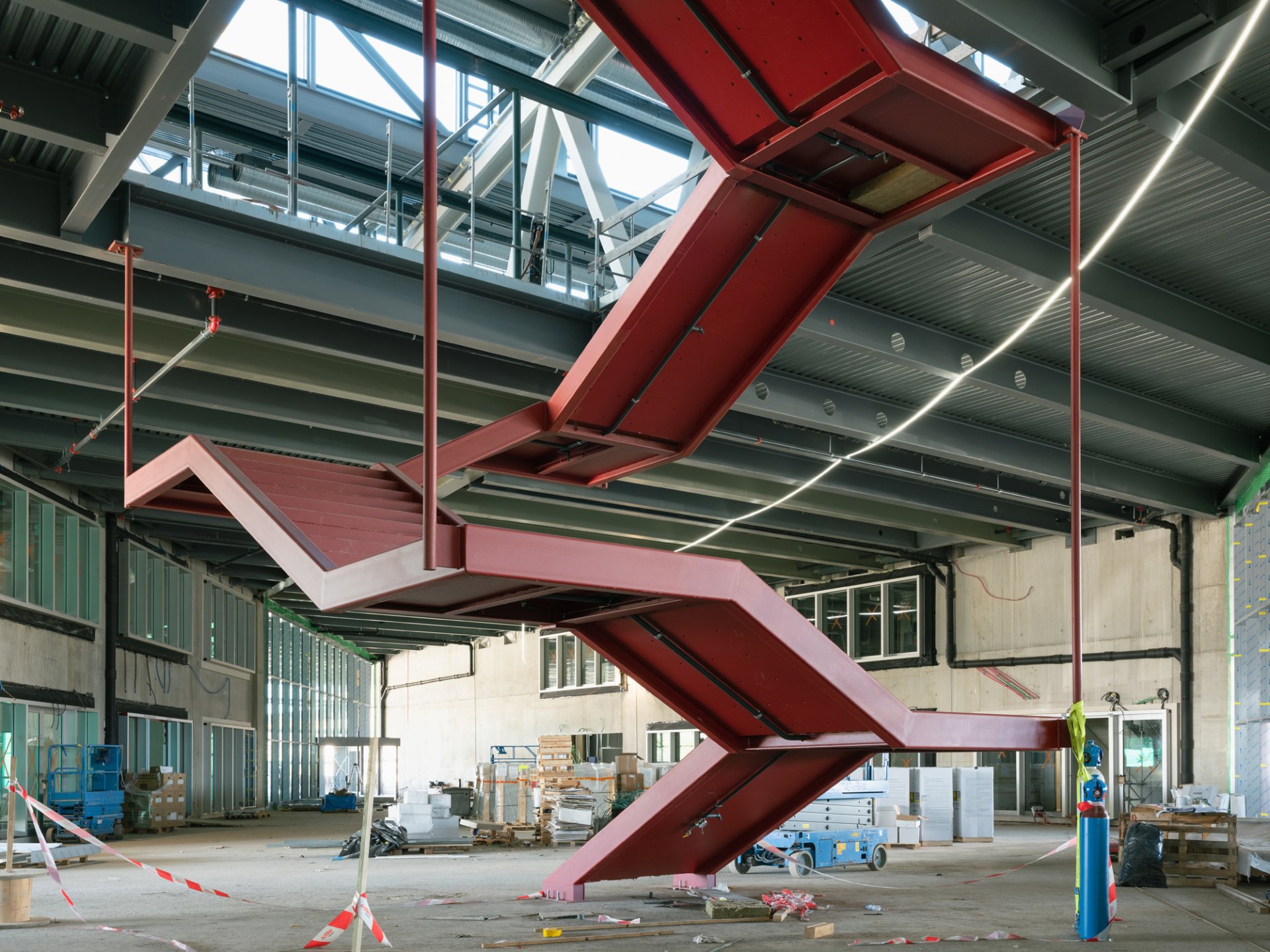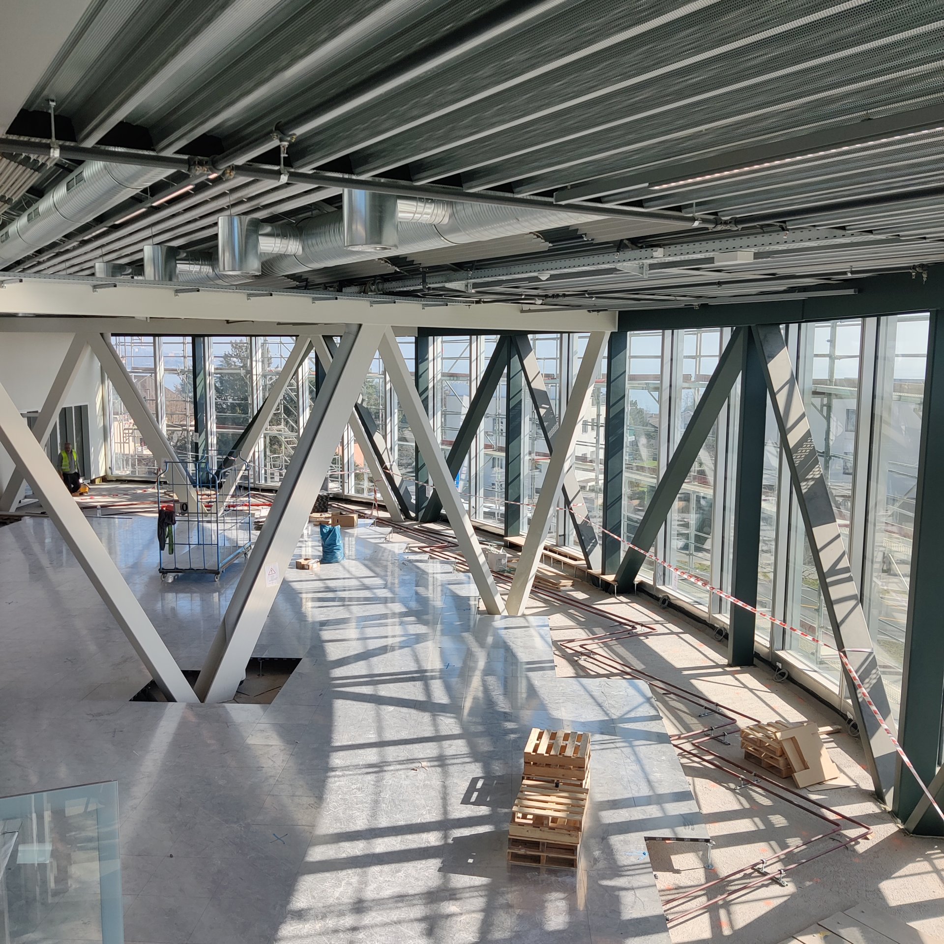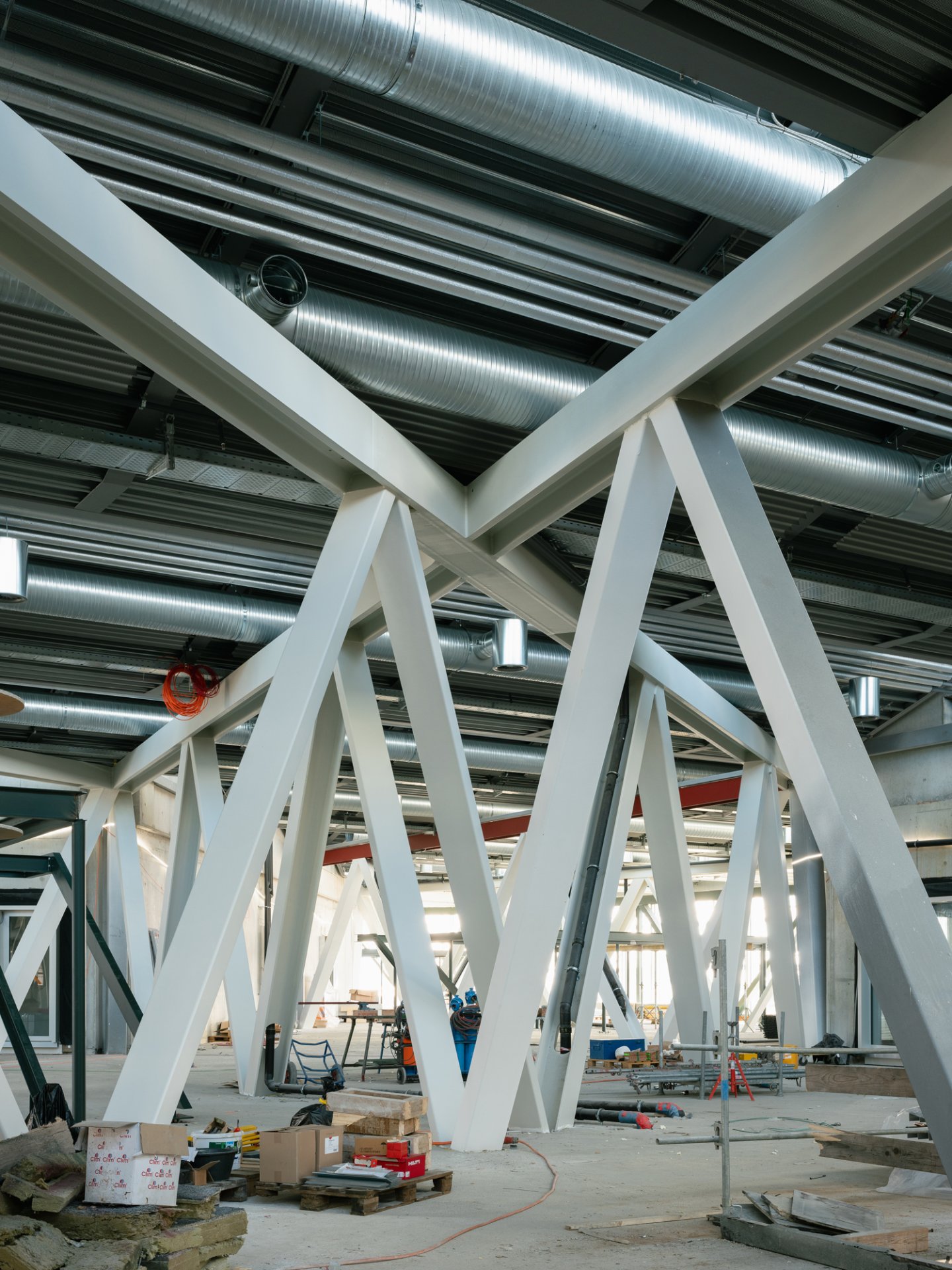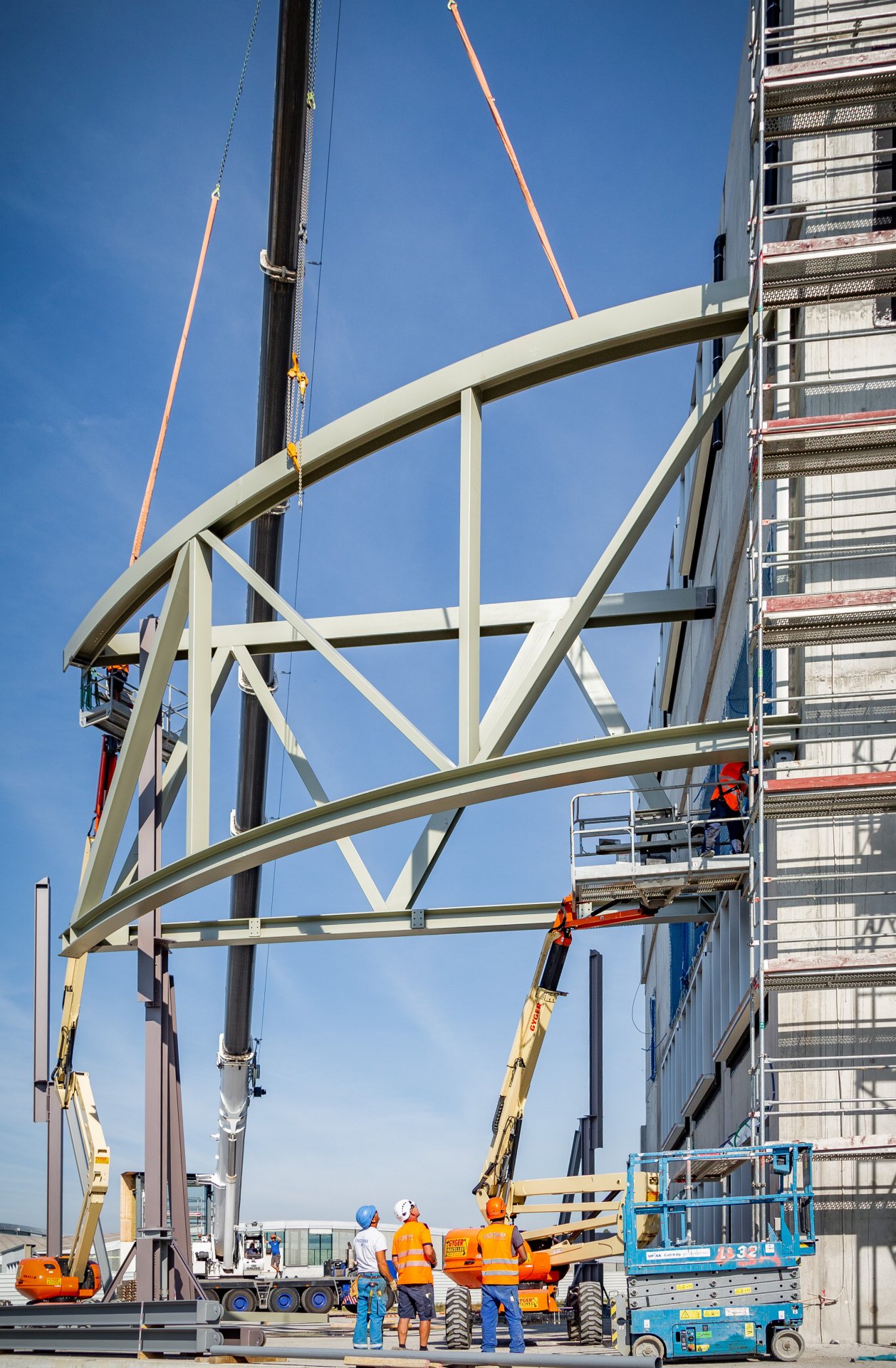 Schließlich weist das künftige RTS-Gebäude eine komplexe Geometrie mit gebogenen Fassadenträgern auf. Die unregelmäßige Anordnung der Hauptträger wurde in einem algorithmischen Prozess in der Entwurfsphase des Tragwerks optimiert, um die Verformung der Struktur und damit die erforderliche Stahlmenge zu minimieren.