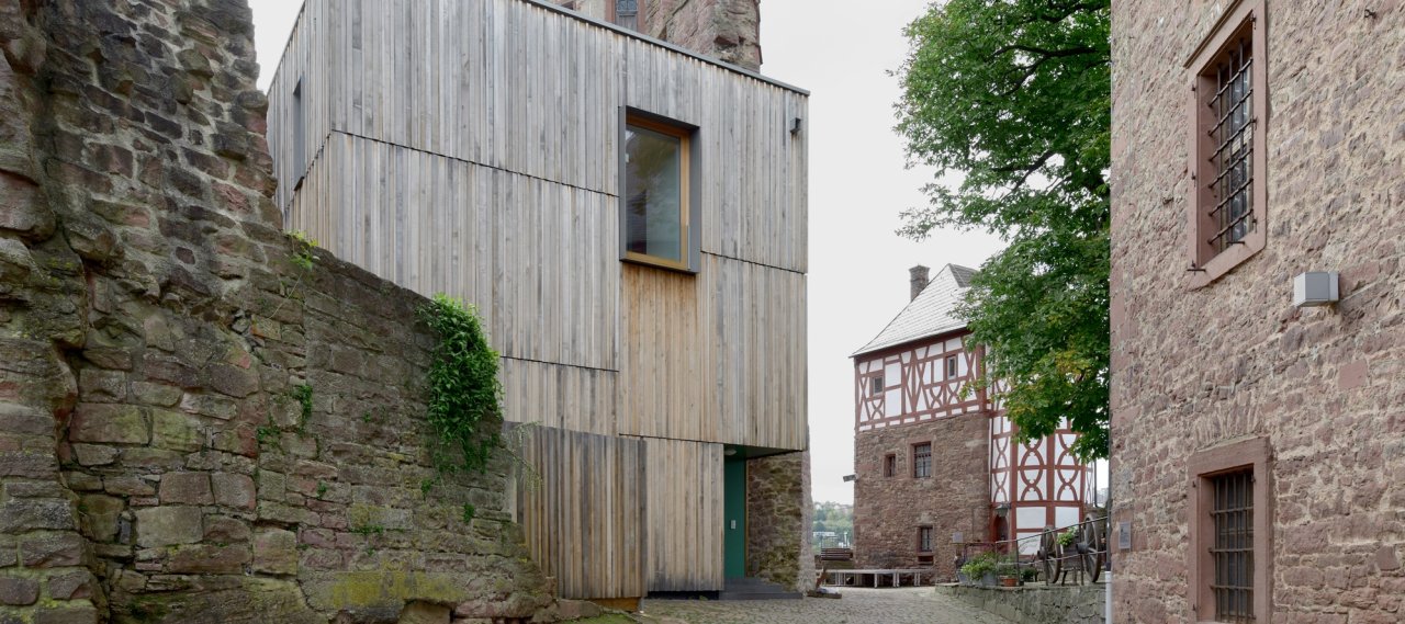 The local restaurant in the ruin of Wertheim Castle was extended by a new terrace in the inner courtyard of the so-called Löwensteiner Flügel, which leads to a vertical room division and an increase of the usable area. The open top terrace is now connected to the existing dining area and the neighbouring castle tavern by a new staircase. The terrace construction consists of a steel girder grid with a concrete surface, supported on an exposed concrete wall and two reinforced concrete columns. The kitchen next to the castle tavern was dismantled and replaced by a two-storey extension building in timber-framed construction, which is connected to the castle at each storey.