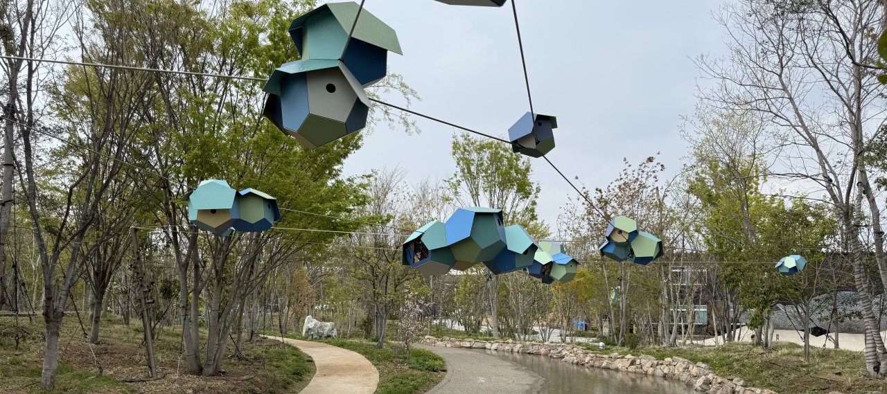 Structurellement, l'installation est ancrée par un fin réseau de câbles de traction qui soutiennent des modules en forme de plateaux et des formes de nids ; la légèreté du système dément son ambition spatiale, utilisant la gravité et la suspension plutôt que des masses lourdes. L'œuvre d'art associe un programme écologique à une matérialité sculpturale, incitant le spectateur à réfléchir à la mobilité, à l'habitat et à l'avenir des communautés multi-espèces dans un geste architectural unique et homogène.