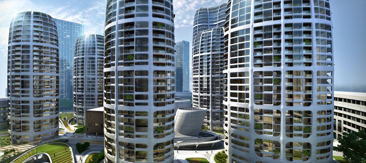 Penta Investments Limited is planning the creation of a “new city centre” in Bratislava with the highest quality of urban spaces and architecture. Zaha Hadid Architects won the architectural competition in collaboration with Max Fordham Consulting Engineers and Bollinger+Grohmann. Seven new high-rise towers with heights of 80 m to 115 m are part of the master plan. The buildings all having an elliptical footprint will be arranged on a staggered grid in a way that an inviting public space develops. In its centre an old industrial building will be transformed and expanded into a new cultural centre. All towers and the cultural centre are built on a mutual underground parking garage.