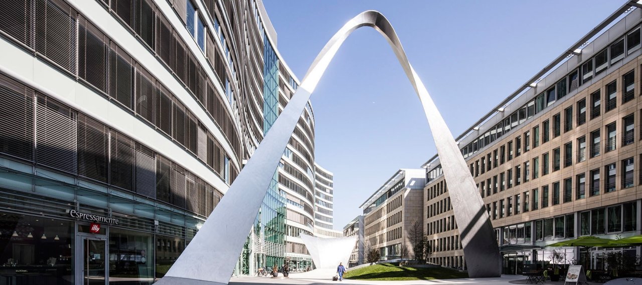 The sculpture is located in the courtyard of the existing building complex "Die Welle" in Frankfurt. It is divided into six sections, three of which dissolve as arches in different heights from the ground.
