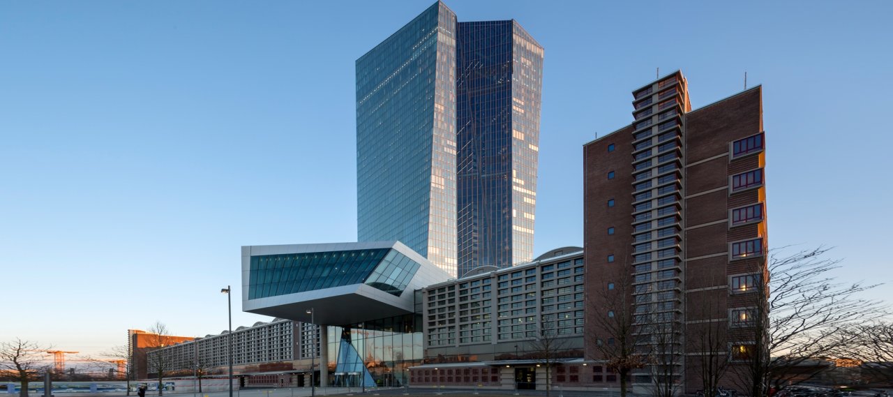 Der Neubau der EZB ist auf dem Grundstück und in Verbindung zur denkmalgeschützten Großmarkthalle im Osten Frankfurts entstanden. Die markanten 185 und 165 m hohen Türme erstrecken sich in voller Höhe über ein verglastes Atrium und verschmelzen somit zu einer Einheit. Die denkmalgeschützte Großmarkthalle hat im Rahmen ihrer Integration in die Anlage eine Umnutzung erfahren. Ein „Bügel“ durchschneidet die Dachzone der Halle diagonal und markiert im Norden den neuen Haupteingang.