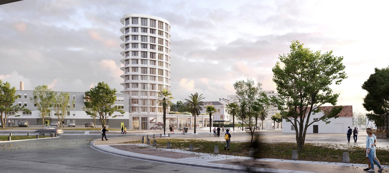 The ESBAN is a student residence located in the heart of an urban block in the Petit Maroc district of Saint-Nazaire. The project consists of commercial spaces at the ground level and is topped by a slender oval-shaped tower of 12 floors, corresponding to the student residence.