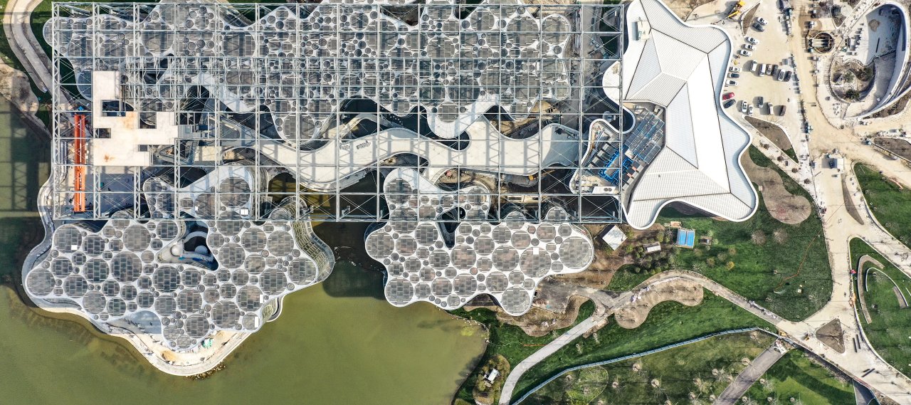 The Expo Cultural Park Greenhouse Garden is integral to Shanghai’s urban development plan. The design of the three new greenhouses incorporates an existing steel structure, creating a unique blend of old and new. The greenhouses are housed in separate pavilions and are connected by a central walkway from the entrance building. The pavilions’ shape naturally evolves from the existing steel structure, giving it an organic feel.