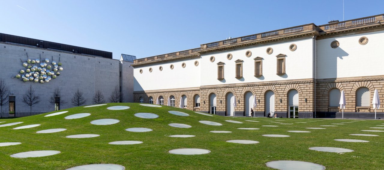 The extension is placed along the central axis reinstating the historic spatial arrangement. The new space below the garden houses the 20th-century art collection. This space is dominated by a gently domed, airy ceiling with circular roof lights. The domed ceiling is a prominent feature in the topography of the garden above and resembles a land art object.