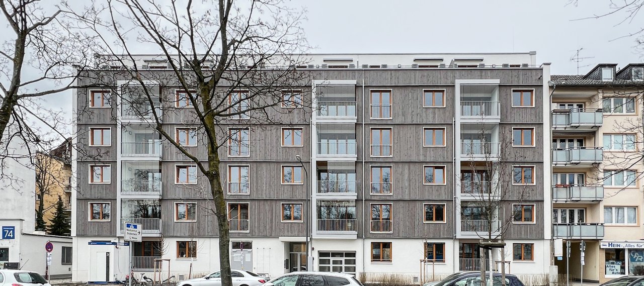 The buildings are constructed of cross-laminated timber from the ground floor up to the load-bearing structure of the roofs. In the apartments, the ceilings are wooden, with an additional 6 cm of cross-laminated timber for fire protection. The basement, the underground car park, and the staircase in the front building are made of reinforced concrete. The floor slab and walls in contact with the ground were realised as waterproof concrete.