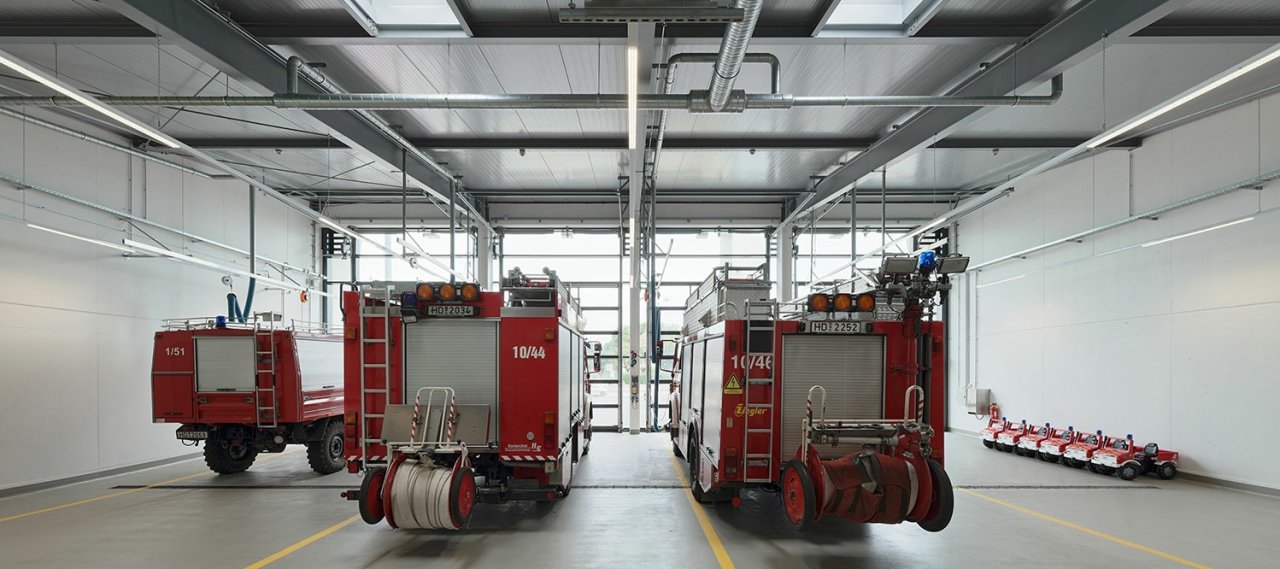 The new fire station is approximately 41 meters long and 20 meters wide. It consists of a steel hall and a masonry building. The single-storey masonry part of the building was planned as a solid construction with a biaxially tensioned reinforced concrete ceiling made of semi-prefabricated parts. It has predominantly load-bearing interior walls made of sand-lime brick and a few interior columns made of reinforced concrete. The garage hall is spanned by a steel structure. In the longitudinal direction of the hall, three main girders run as the primary supporting structure. In the transverse direction, the main girders are spanned by secondary girders, which in turn are covered with a trapezoidal sheet. The foundations were laid on strip and individual foundations.