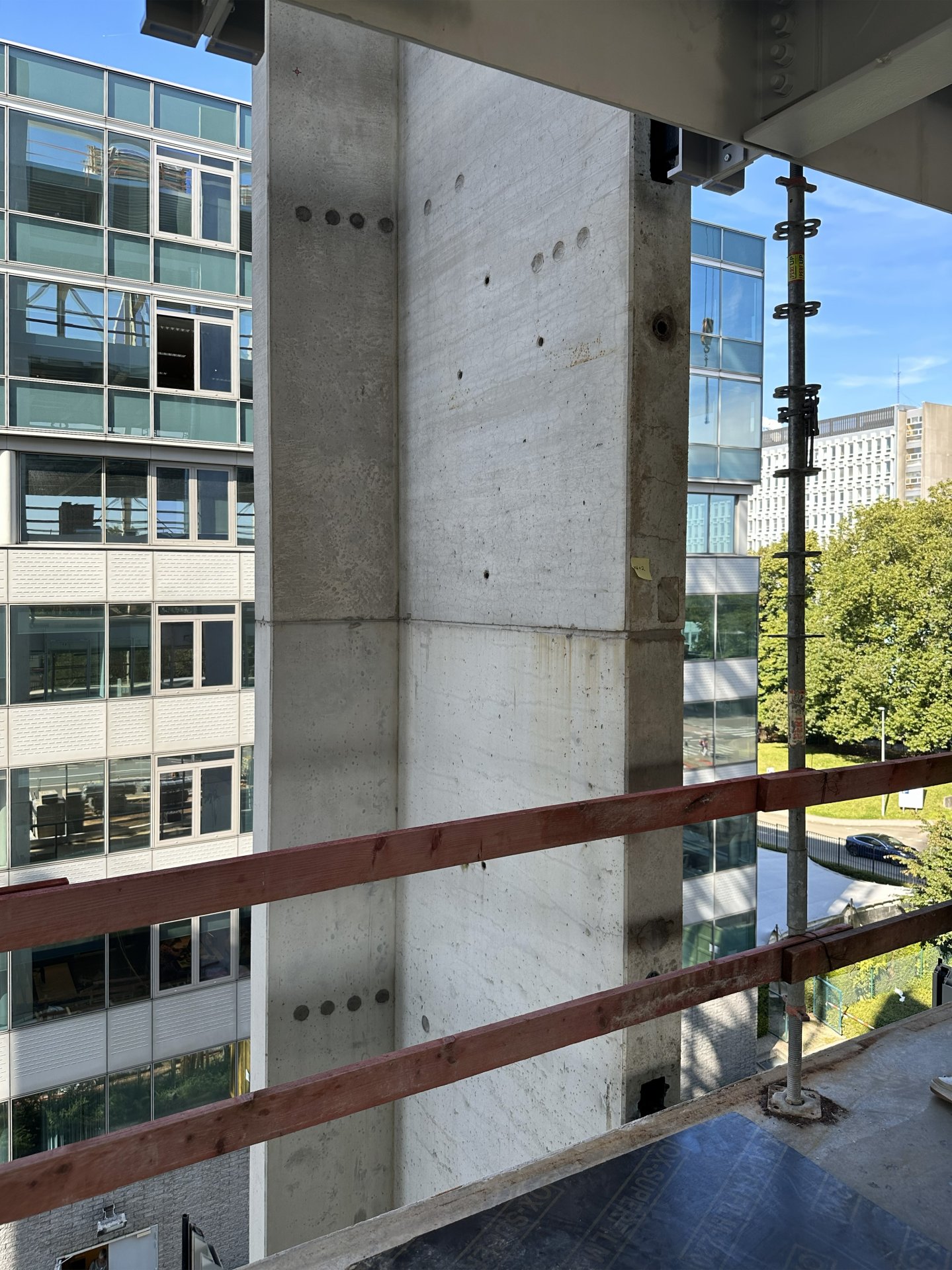 The south façade consists of a steel frame composed of rectangular steel profiles. It is completed by a three-dimensional lattice structure, a load-bearing facility consisting of tensile and compression profiles. This façade supports the floors, which have a span of 15 m. On the north side, they are supported by precast concrete T-shaped elements. These floors are composed of a mixed precast steel/concrete system.