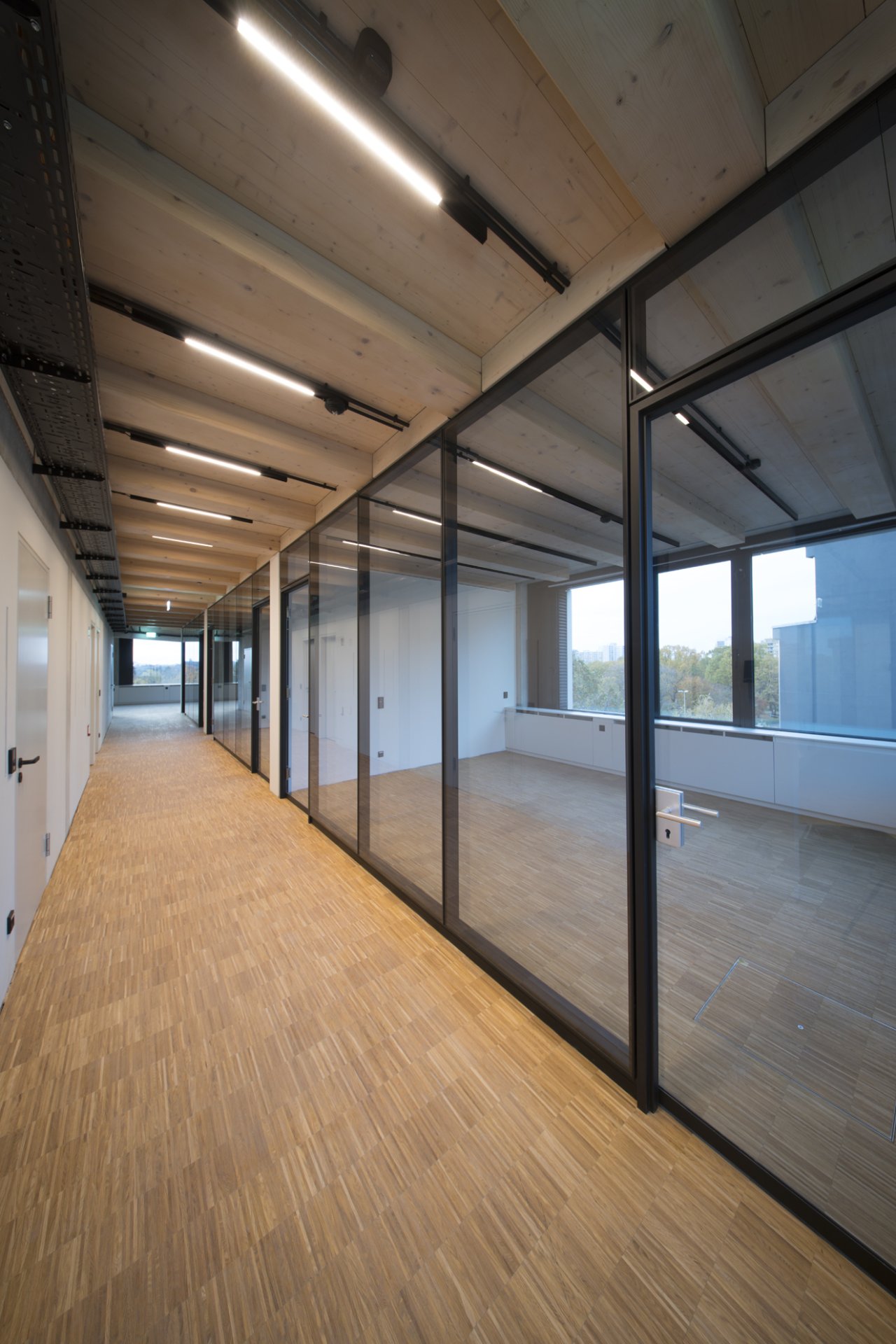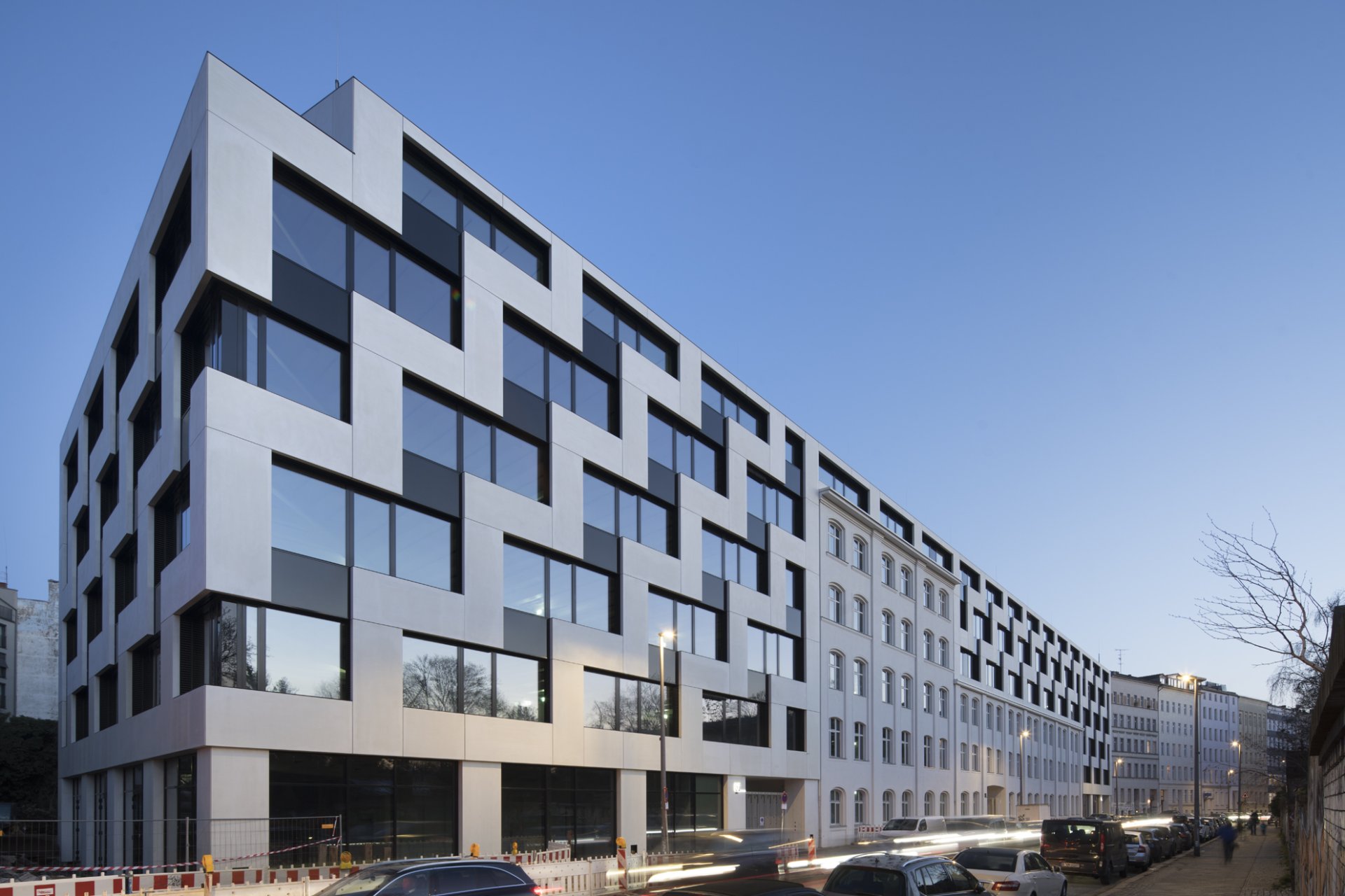 The new buildings were mostly constructed using a timber hybrid method. The project presented technical challenges in both renovation and new construction, including eccentric load transfer, facade complexity, and existing structural deficiencies. The new buildings are designed to meet the German KfW 55 energy efficiency standard and and the entire project is certified with BREEAM Excellent.