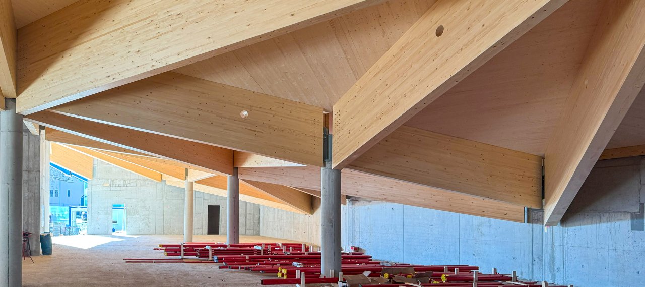 The hill's complex shape was achieved using a triangular mesh that divides its surface into regular triangles. These triangles are constructed from three straight beams, creating a flat surface suitable for construction. The structural system of the residential building consists of reinforced concrete floors supported by steel trusses and columns. Additionally, bracing is provided by two reinforced concrete cores clamped in the basement box. The ‘Europa Achse’, which runs through the center of the entire neighborhood, divides the hill into two parts. The planning challenge was to adapt the column grid for the residential building and the hill, resulting in spans of up to 20 meters.