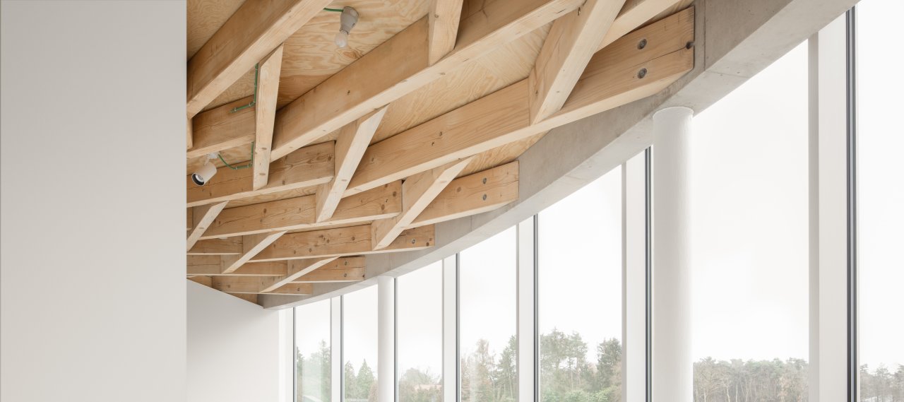 The walls, made of a reinforced concrete framework and sand-lime blocks, vary in height from 2.3 to 5.9 m and support a conical wooden roof with a radius of 14.5 m. The roof is formed by around 1,000 massive timber reciprocal beams of 8 cm x 23 cm and a maximum length of 6 m. The combination of inward-slanting walls and a self-supporting roof creates a free plan.