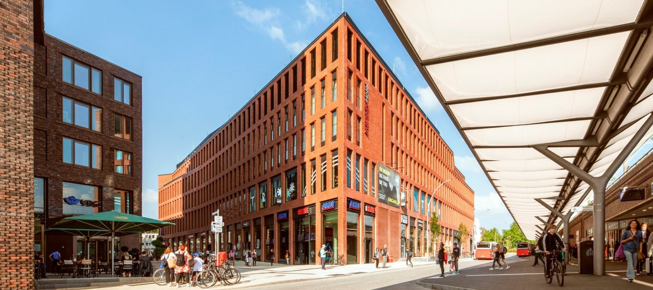 A new modern mixed-use building has been constructed on the site of the former German “Hertie” department store at Hamburg’s Barmbek station. The existing building was demolished and replaced by a new four-storey building including two basement levels.