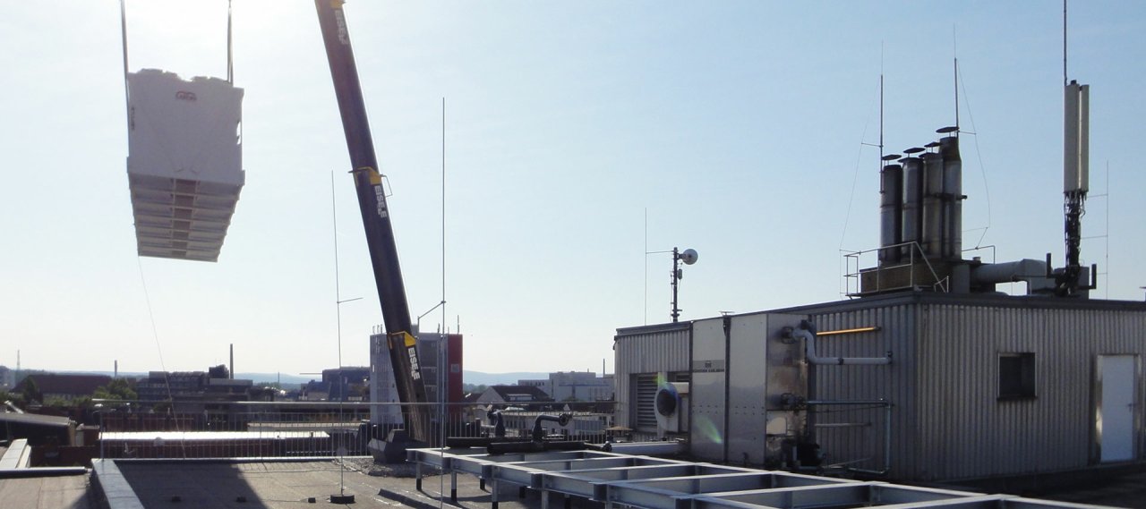 A mobile crane removed the existing recooling unit from the roof. The building services were then dismantled and reassembled. The substructure in the delivery area was assembled in one piece and lifted onto the roof using a mobile crane. The roof was opened up in the area of the support feet and reworked before the substructure was installed. Finally, a second mobile crane was used to lift the new recooling unit, weighing approximately 5.5 tonnes, onto the pre-assembled substructure. Once the chillers were installed in the basement, the commissioning process began. The project's primary focus from a health and safety perspective was on fall protection on the roof, lifting heavy loads, construction during ongoing operations, and the proper disposal of hazardous substances (refrigerant R22).