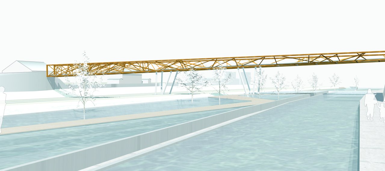 The bridge's impact is achieved by its symbolism: the design refers to early steel constructions. The load-bearing structure equates to a framework; the "free" position of the trusses symbolises a new beginning. The structure is built as an irregular stick framework, its structure generated by an optimisation algorithm.