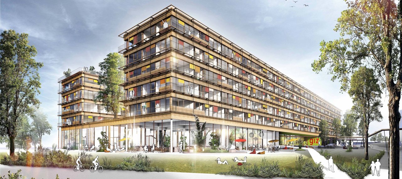 A compact campus for the Deutsche Gesellschaft für Internationale Zusammenarbeit (GIZ) GmbH is constructed in Eschborn West on a 53,000 m² area. The building has six stories, with around 32,000 m² above ground and 21,000 m² underground. It includes communal areas, and flexible workspaces for about 1,000 employees, and meets the highest standards of the German Sustainable Building Council. Additionally, two basement levels are included for car and bicycle parking, as well as storage and technical areas. The project was developed by PHOENIX, a company based in Frankfurt, and the design is by the Viennese architecture firm, Caramel, winner of an international architectural competition. The new building is a reinforced concrete skeleton construction.