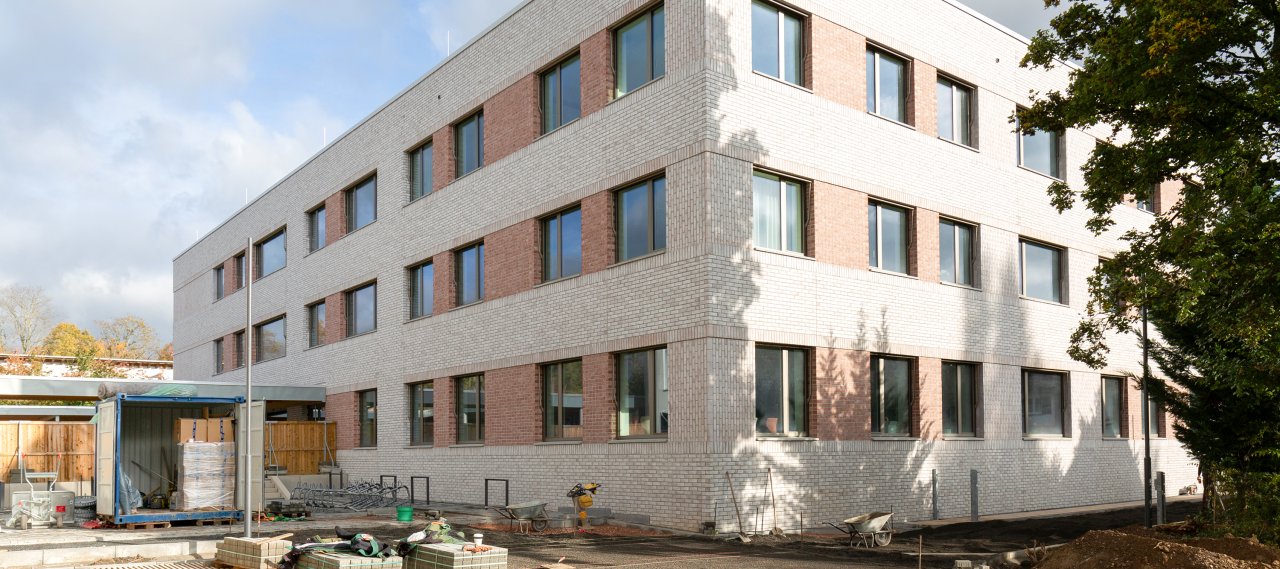 The high school on Mosbacher Berg has been given a new building that houses the administration, classrooms, and a multi-purpose room. The southern part of the building is used by the teaching staff, the secretary's office, and the school management on three floors, while the northern area is used as classrooms for the E classes. Both areas are connected by an atrium.