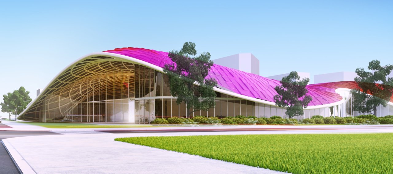 As a system, the shell geometry is flexible and a careful negotiation of structure and program of the recreation centre drives the design. Two formal devices are at the core of scheme: two-way spanning vaults cover the pool areas providing large open spaces; funnel shaped structures provide major points for grounding the structure while offering expansive cantilevers. As an urban landmark, the architecture draws strong colours, the roof form covered by abstracted images of the lantana plant. This provides visual references as pedestrians and surrounding building glimpse parts of this recurring and common motif.