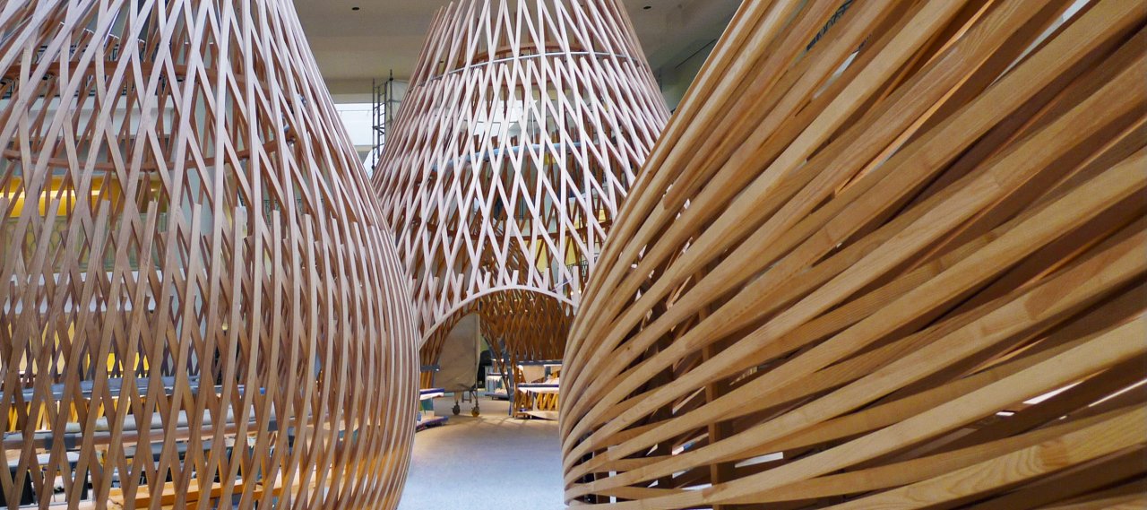 A pavilonok geometriája és a fa rácsok elrendezése az építészek iránymutatásai alapján került kialakításra. A fa lécek maximális távolsága körülbelül 20 centiméter, az alsó részen a további gerendák miatt szűkebb a rács. A rudak két rétegben vannak elrendezve, és a kereszteződéseknél csavarokkal vannak rögzítve. A nyíróerők és a hajlítónyomatékok a gerendák között úgy kerülnek átvitelre, hogy a szerkezet stabilitása biztosított legyen.