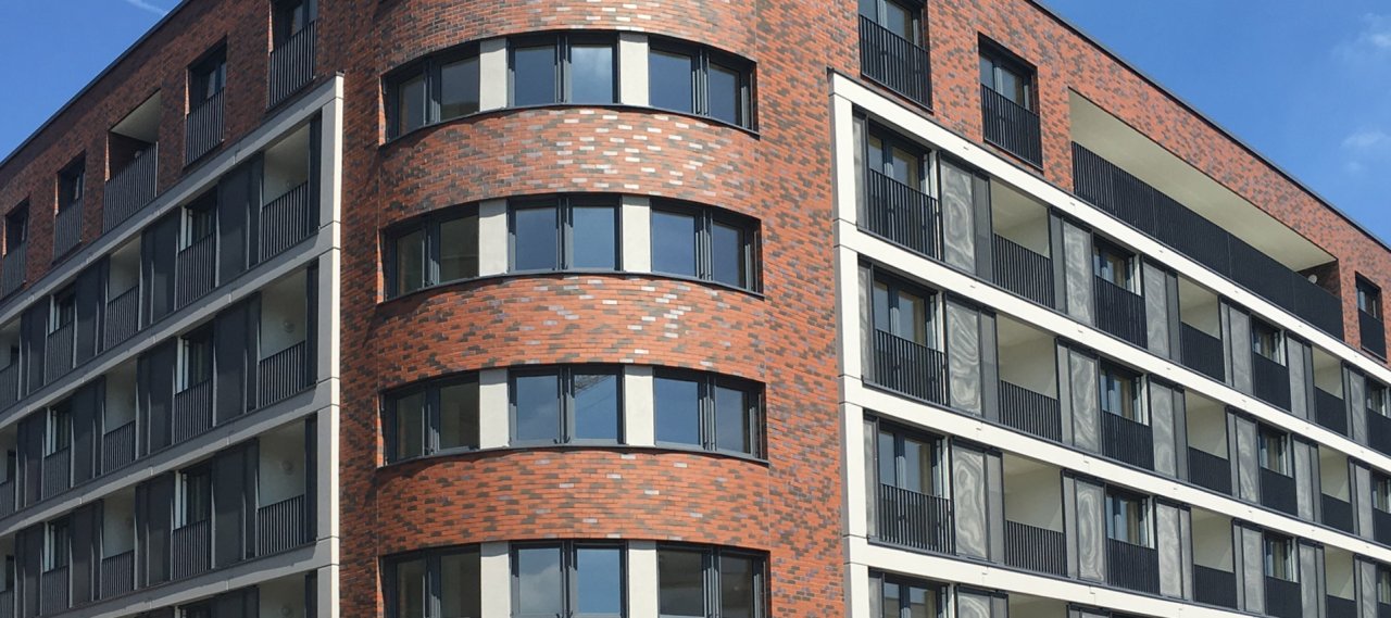 Red cklinker and rounded corners characterize the residential and commercial building in direct vicinity of the former Offenbach Hafen.
