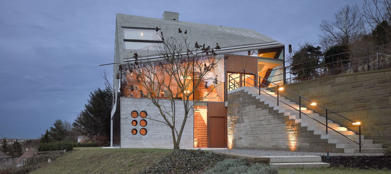 Residential house with a monolithic 50cm strong light-weight insulating concrete envelope for the outer walls and the roof.