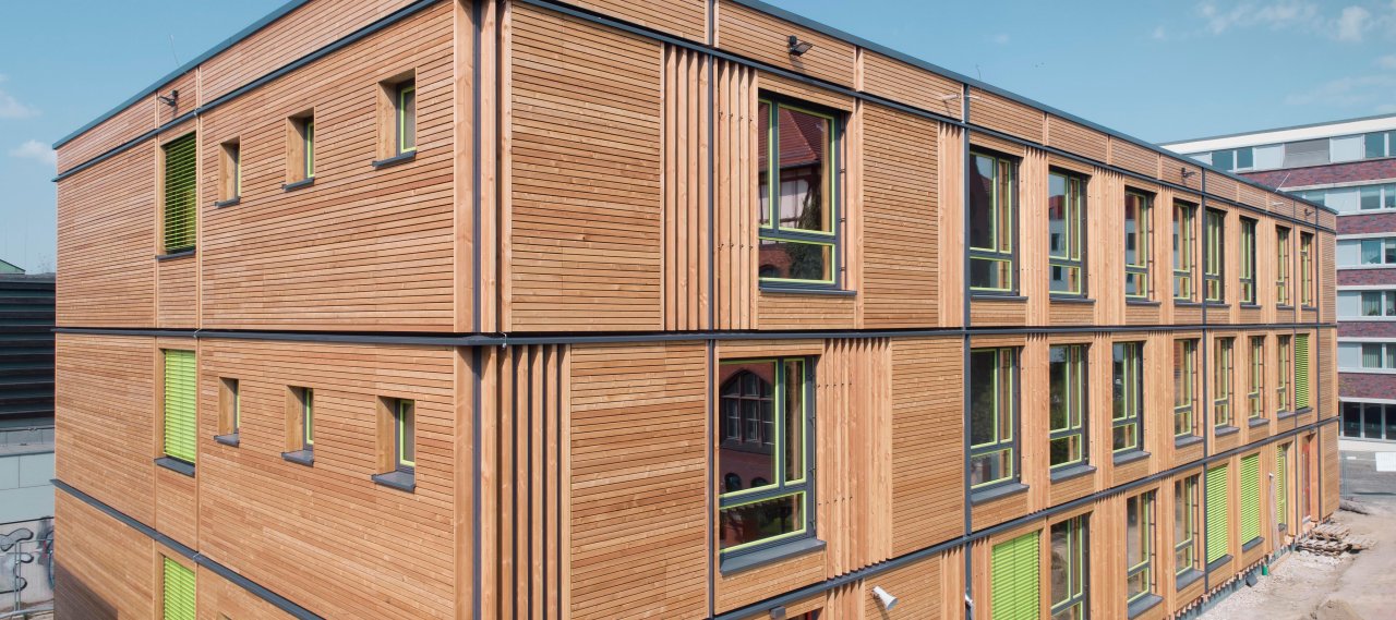 The room modules, which are vertically bounded by the floor slab and the ceiling, were constructed as self-supporting elements. The cross-laminated timber elements of the floor and the ceiling span between the longitudinal axes, in which there are either load-bearing cross-laminated timber walls or a beam supported on columns.