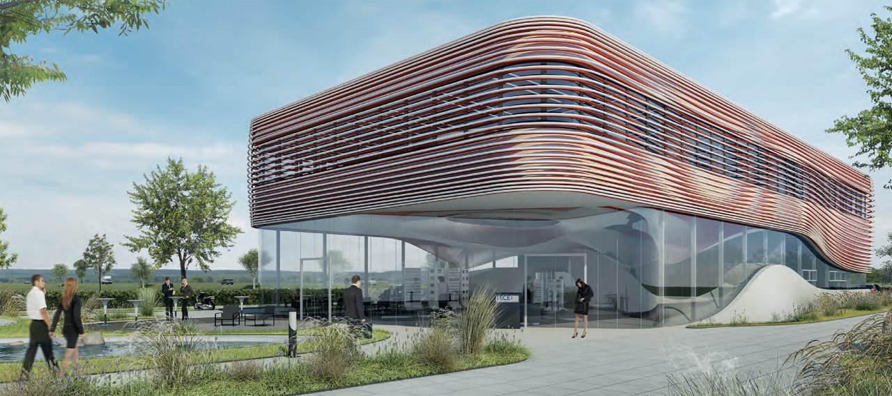 The design for the new TECE Headquarter Austria provides a 40x17m two-storey, rectangular building. The floating building structure which is connected to a continuous “functional landscape” which spreads below is a characteristic feature of the design. The showroom located in the area of the vertical atrium forms the center of the building. The reception and the bar evolve from the “functional landscape”. The bistro is quasi the extension of the outdoor terrace. The upper floor houses the administrative, social and storerooms and the building services.