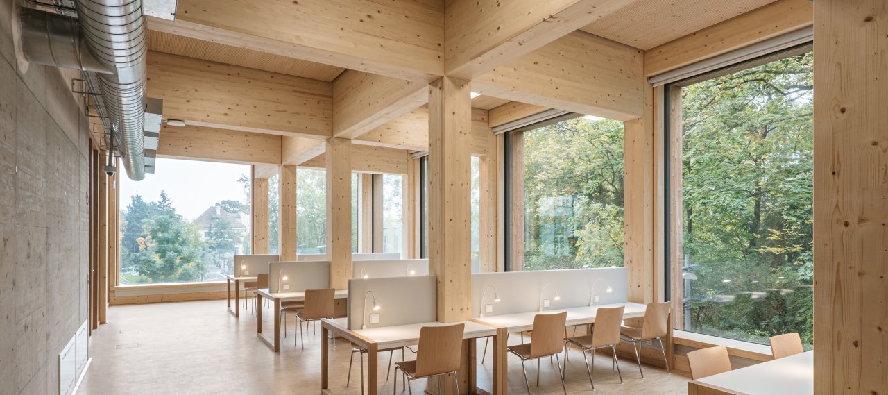 The University of Natural Resources and Life Sciences (BOKU) seminar centre in Vienna hosts a library with one hundred reading places and institute rooms located on the four storeys of the building. The support structure over the floor-to-ceiling height glazing becomes a design element that creates a dialogue between the interior and the surroundings. The façade grid continues into the interior ceiling construction of the library. The wooden construction and façade surfaces remain untreated.