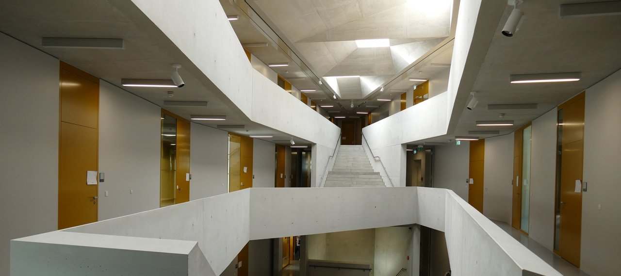 The building was designed as skeleton construction as a concrete structure so that partition walls can be positioned flexibly. The façades are divided into ribbons with fixed glazing and insulated concrete parapets.