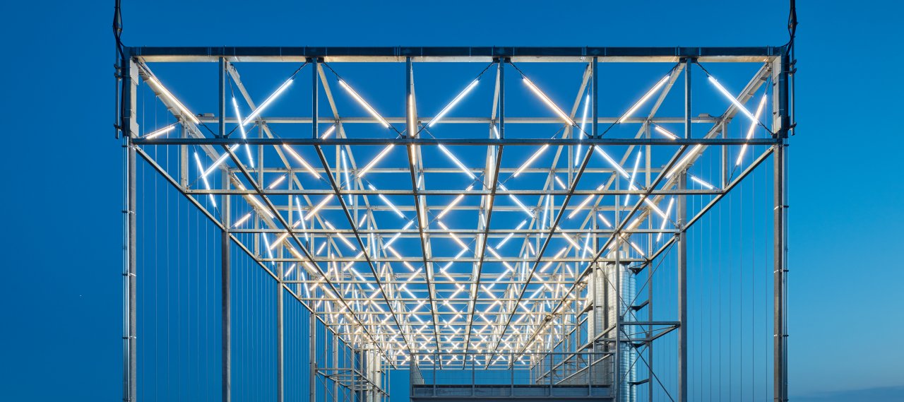 The terrace construction is an orthogonal steel girder grate with a dominant clamping direction mounted on the existing shafts. The filigree trellis is a spatial framework consisting of square profiles and tension rods. Originally intended only as a roof, this construction was led from the horizontal to the vertical in parts of the side surfaces. This creates a rigid space-forming truss frame, which essentially ensures horizontal stiffening.